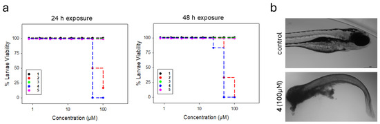 (a) Percentage viability of the zebrafish larvae incubated in different concentrations of compounds 1–5 after 24 h (right) and 48 h (left) of exposure, n = 6 larvae in each group; (b) Representative images of a zebrafish larva without and with treatment. Upper image (control) shows a healthy larva without treatment exhibiting no abnormalities; lower image shows larva exposed to 100 μM of compound 4 for 24 h exhibiting structural deformities and body breakdown.