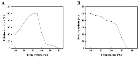 Effects of temperature on the activity (A) and stability (B) of Alyw203. The 100% relative enzyme activity in subfigures (A,B) is equal to 1163 U/mg.