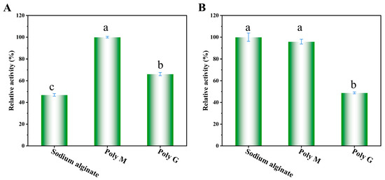 Substrate specificities of Alyw203 (A) and L172V (B). A total of 0.1 mL at 10 mmol/L of their optimal pH buffer containing 1% (w/v) substrates (sodium alginate, Poly M, and Poly G) was taken, 0.2 mL of enzymes (0.04 mg/mL) was added, and the mixture was reacted at their optimal reaction temperatures for 30 min. The 100% relative enzyme activity for Alyw203 and L172V was equal to 2854 and 1474 U/mg, respectively. Data points labeled with different lowercase letters are significantly different from each other (p < 0.05). The same letter indicates no significant difference.