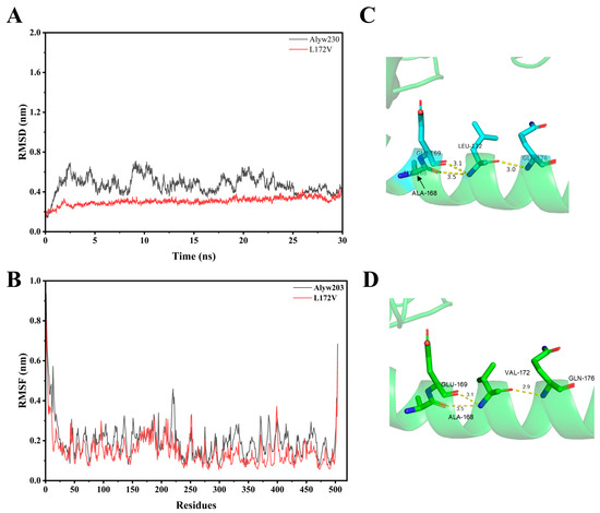 Comparison of root mean square deviation (RMSD), root mean square fluctuation (RMSF), and local hydrogen bonding network of Alyw203 and L172V. (A) RMSD of Alyw203 and L172V after a 30 ns molecular dynamics simulation; the average RMSD values of Alyw203 and L172V were 0.47 and 0.31, respectively. (B) RMSF of Alyw203 and L172V after a 30 ns molecular dynamics simulation; the average RMSF values of Alyw203 and L172V were 0.20 and 0.15, respectively. (C) The local hydrogen bonding network of Leu172 residue in Alyw203. (D) The local hydrogen bonding network of Val172 residue in L172V.