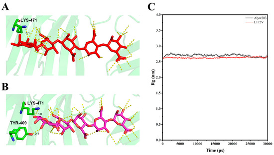 Comparison of substrate binding characteristics and radius of gyration (Rg) of Alyw203 and L172V. (A) Schematic diagram of hydrogen bonding between residue Lys471 and ligand in Alyw203–pentamannuronic acid. (B) Schematic diagram of hydrogen bonding between residues Lys471 and Tyr469 and ligand in L172V–pentamannuronic acid. (C) Rg of Alyw203 and L172V after a 30 ns molecular dynamics simulation; the average Rg values of Alyw203 and L172V were 2.70 and 2.63, respectively.