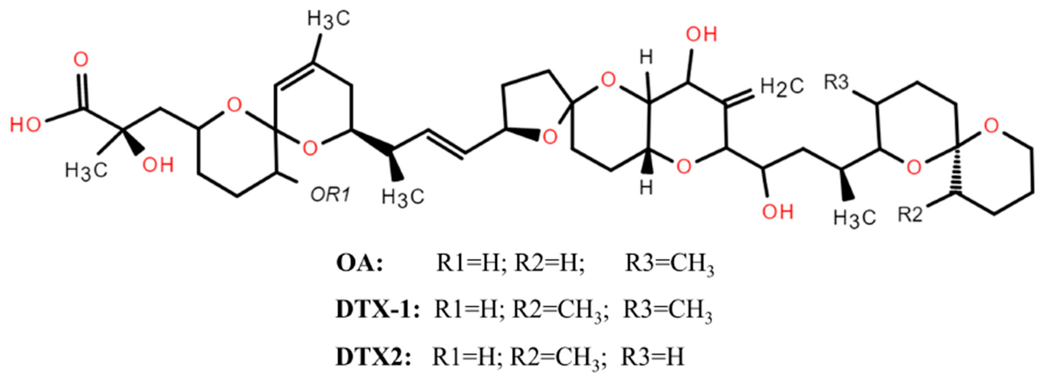 - Corriere, M.; Soliño, L.; Costa, P.R. Effects of the Marine Biotoxins Okadaic Acid and Dinophysistoxins on Fish. J. Mar. Sci. Eng. 2021, 9, 293. [Google Scholar] [CrossRef]