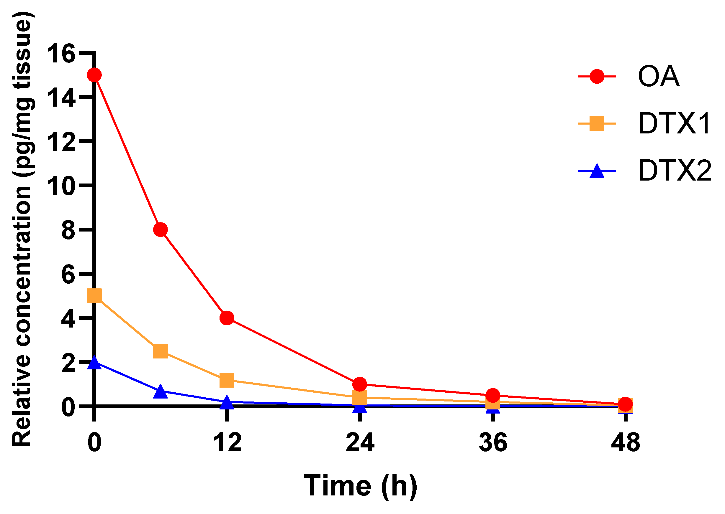 - Blanco, J.; Estévez-Calvar, N.; Martín, H. Excretion Routes of Okadaic Acid and Dinophysistoxin-2 from Mussels (Mytilus galloprovincialis) and Cockles (Cerastoderma edule). Toxins 2025, 17, 128. [Google Scholar] [CrossRef]