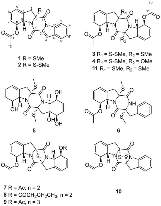 - Kawahara, N.; Nozawa, K.; Yamazaki, M.; Nakajima, S.; Kawai, K. Novel epidithiodioxopiperazines, emethallicins E and F, from Emericella heterothallica. Heterocycles 1990, 30, 507–515. [Google Scholar]