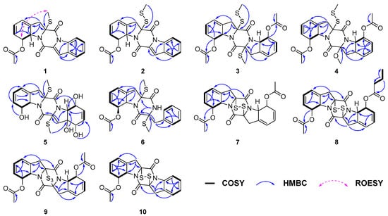 Key COSY, HMBC and ROESY correlations of compounds 1–10.