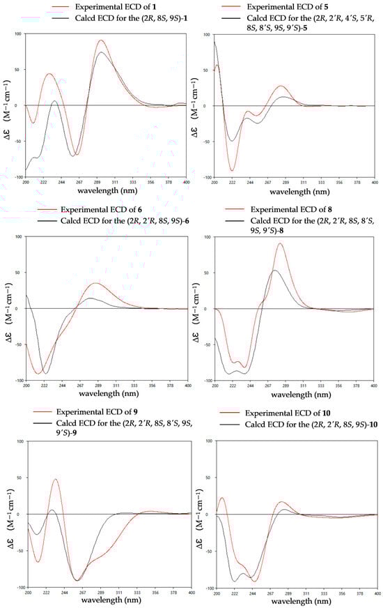 Experimental and calculated ECD spectra of compounds 1, 5–6 and 8–10.