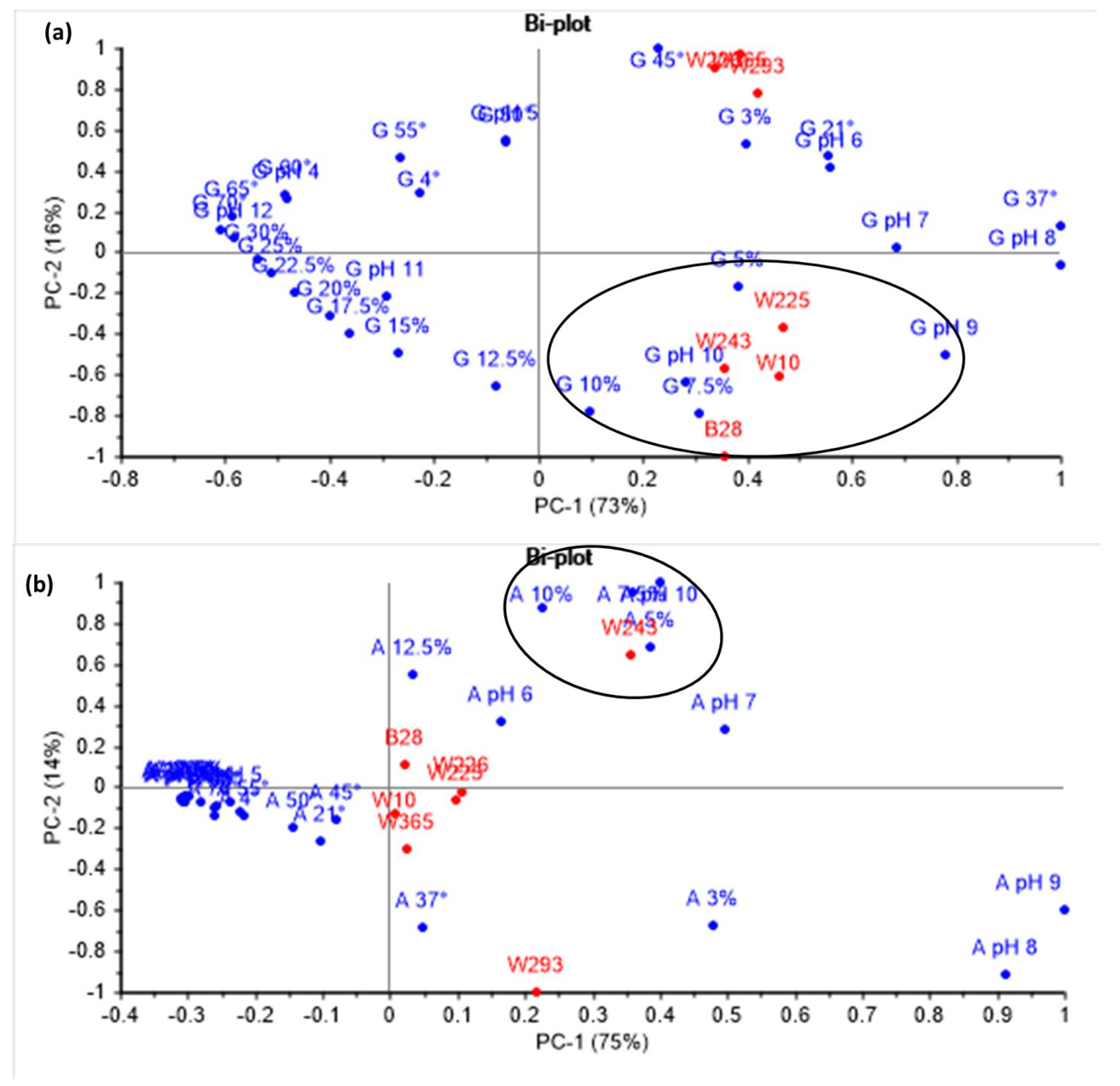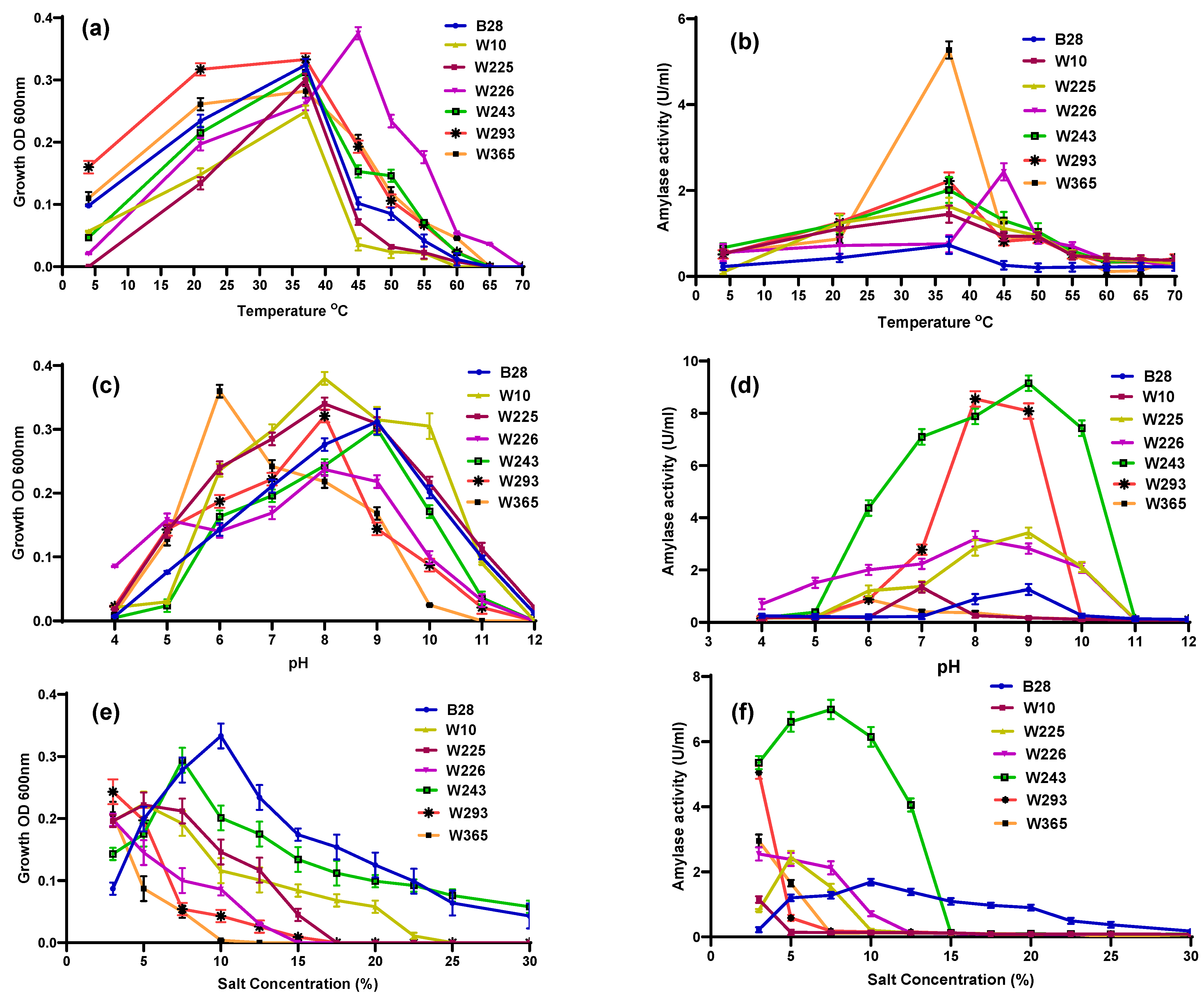 2.2. Growth and α-Amylase Production of the Seven Selected Isolates at Different Temperatures, pH and Salt Concentrations