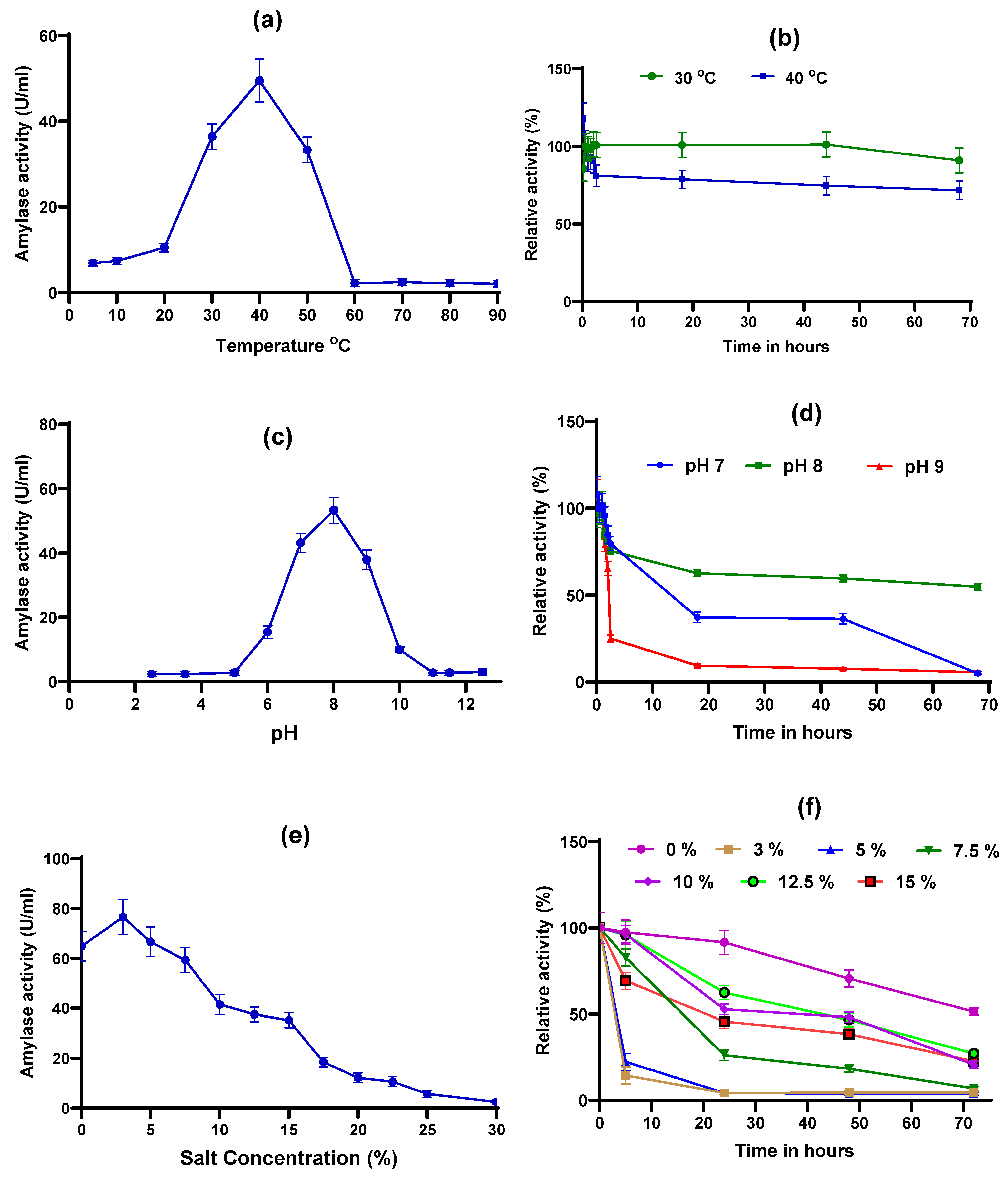3.8.1. Effect of Temperature, pH, and Salt Concentration on the Activity and Stability of the Purified α-Amylase