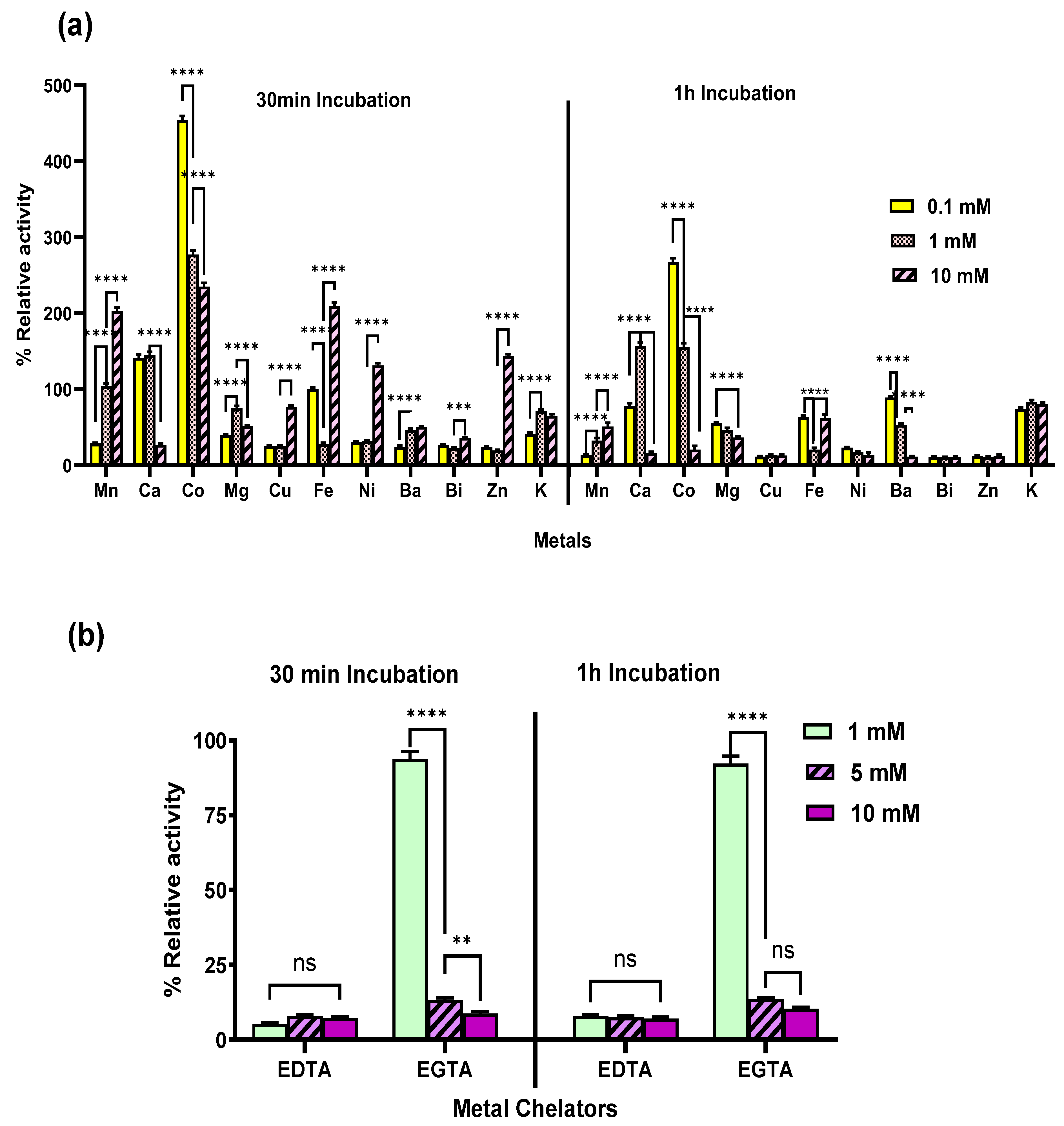 2.5.4. Effect of Metal Cations and Metal Chelators on the Purified α-Amylase