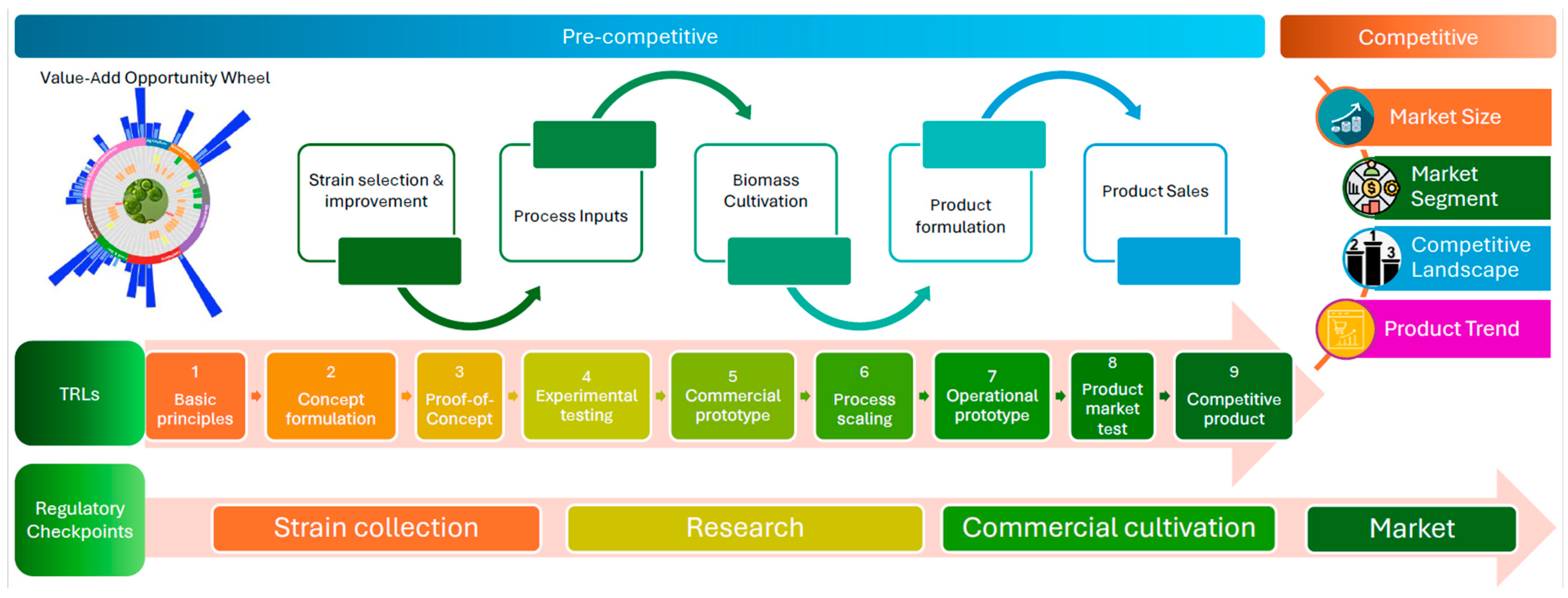 Figure 1. Conceptual framework for an interactive dashboard supporting microalgae product development. The dashboard integrates pre-competitive and competitive market analytics with regulatory pathways to guide businesses, scientists, and researchers through complex innovation stages. It enables assessment of technology readiness levels (TRLs), market and technology trends, and competitive landscapes, while informing strategies for market entry and product positioning. A more detailed explanation of the Value-Add Opportunity Wheel is provided in Section 3.3.