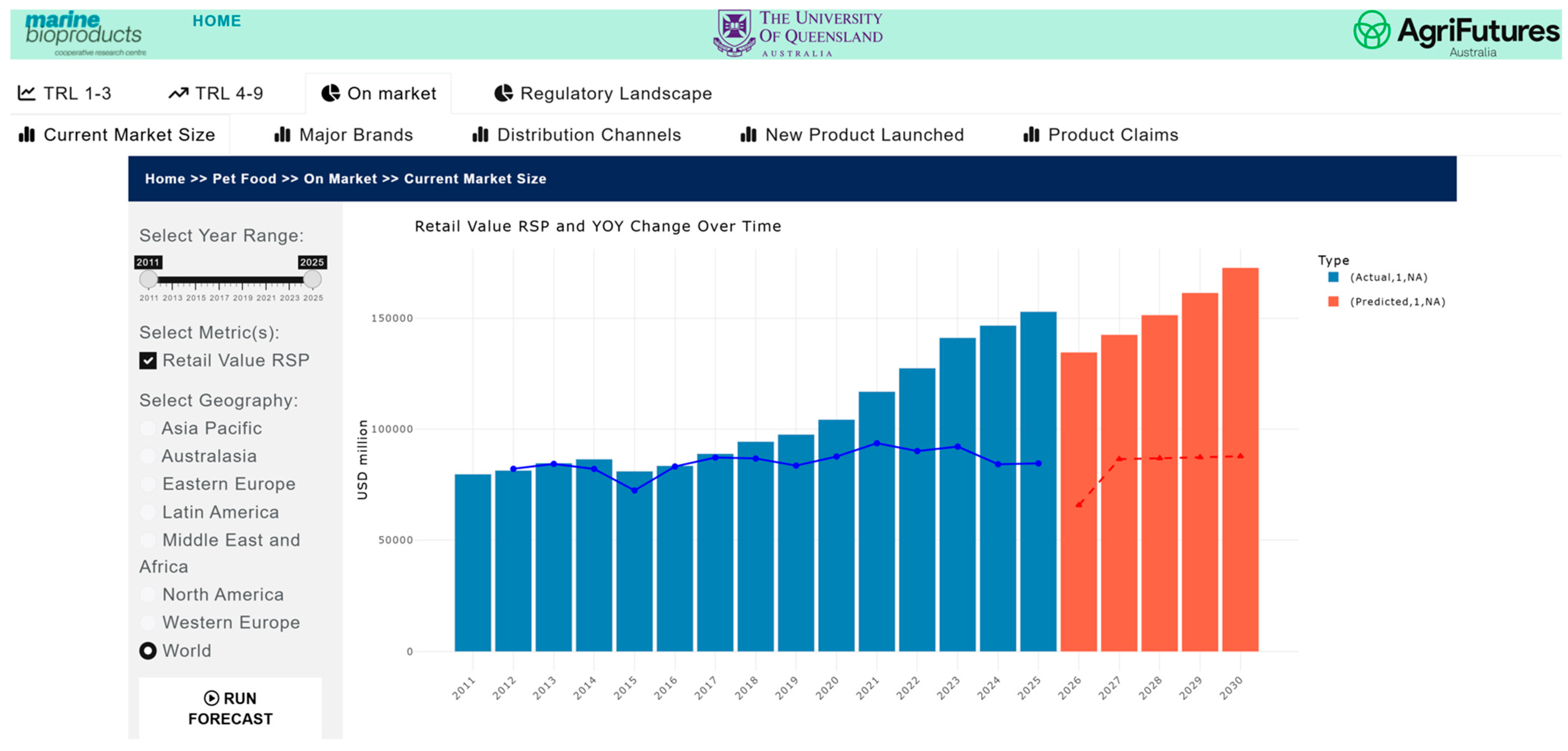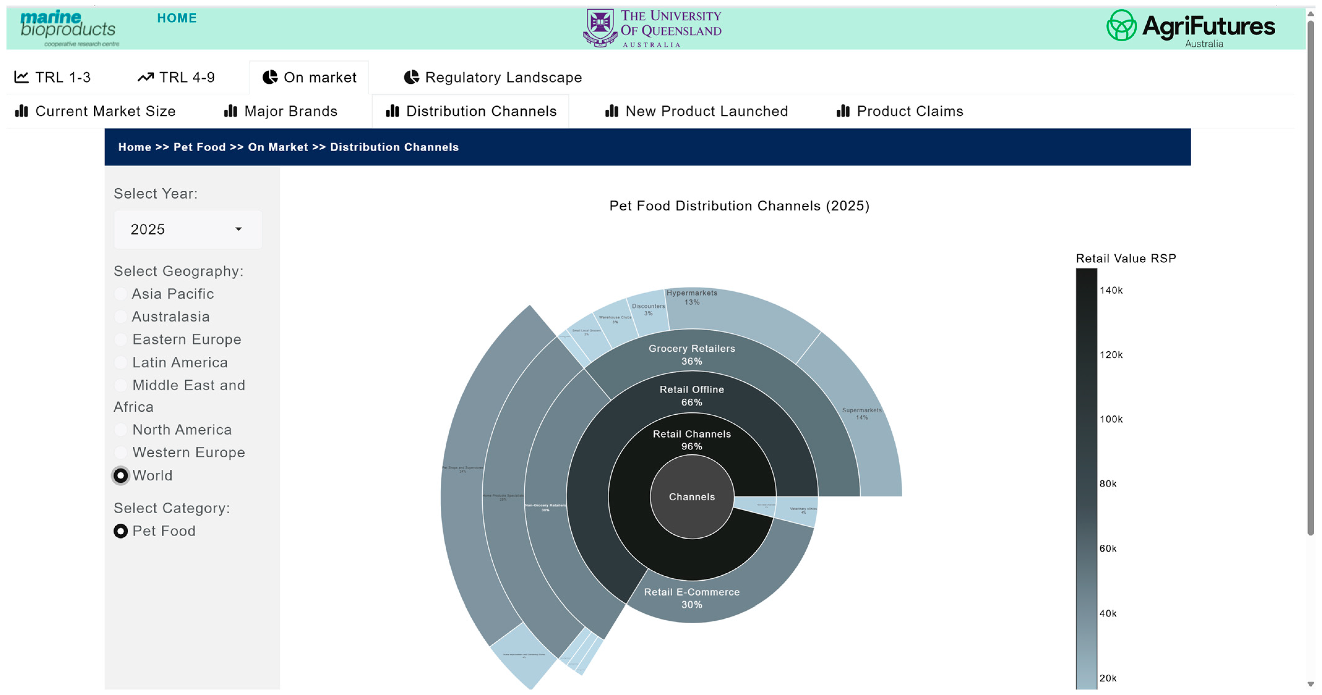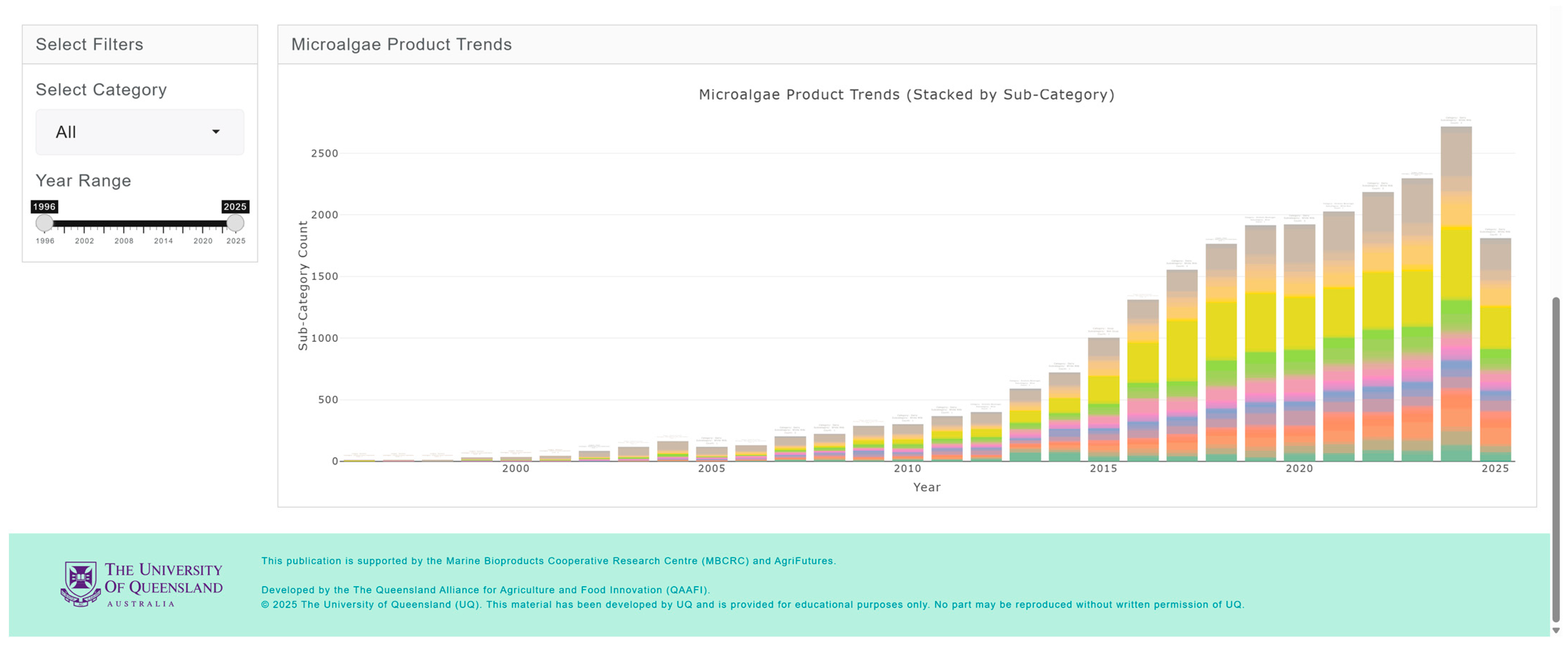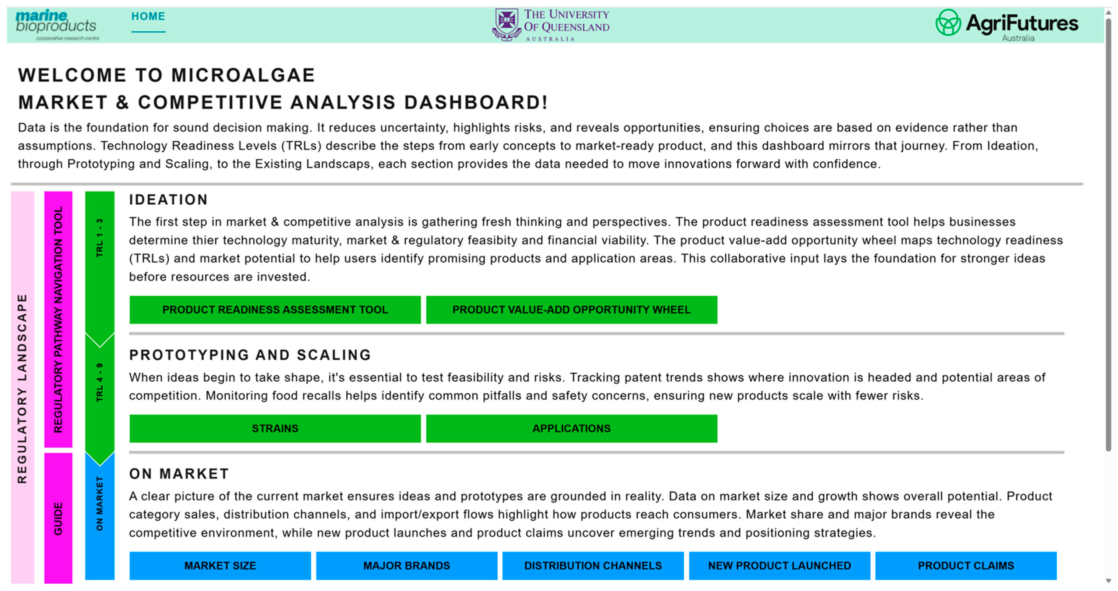 The team, comprising experts in microalgae, law, innovation and business economics, technology strategy, and data science, conducted an in-depth analysis of production, commercialization, and regulatory aspects of the microalgae industry. Specifically, systematic reviews of scientific publications, patents, product launches, market size, and regulatory frameworks were performed using triangulated data sources to map microalgal technological development and applications across both pre-competitive and competitive phases. These analyses provide signals of changing investment, scientific progress or choke points and competitive dynamics, offering insights into industry trends. Large Language Models (LLMs) were applied to patent product launches and product claims data, enabling businesses to more easily assess current and potential microalgae markets. Although significant gaps persist in available microalgae industry data, in Australia as well as globally, as far as possible, the dashboard interface delivers an integrated approach to support business decision making in the microalgal bioproduct sector. A beta-version of the dashboard was released (the dashboard was released for use by microalgae companies in Australia and, therefore, is not openly accessible) in October 2025.