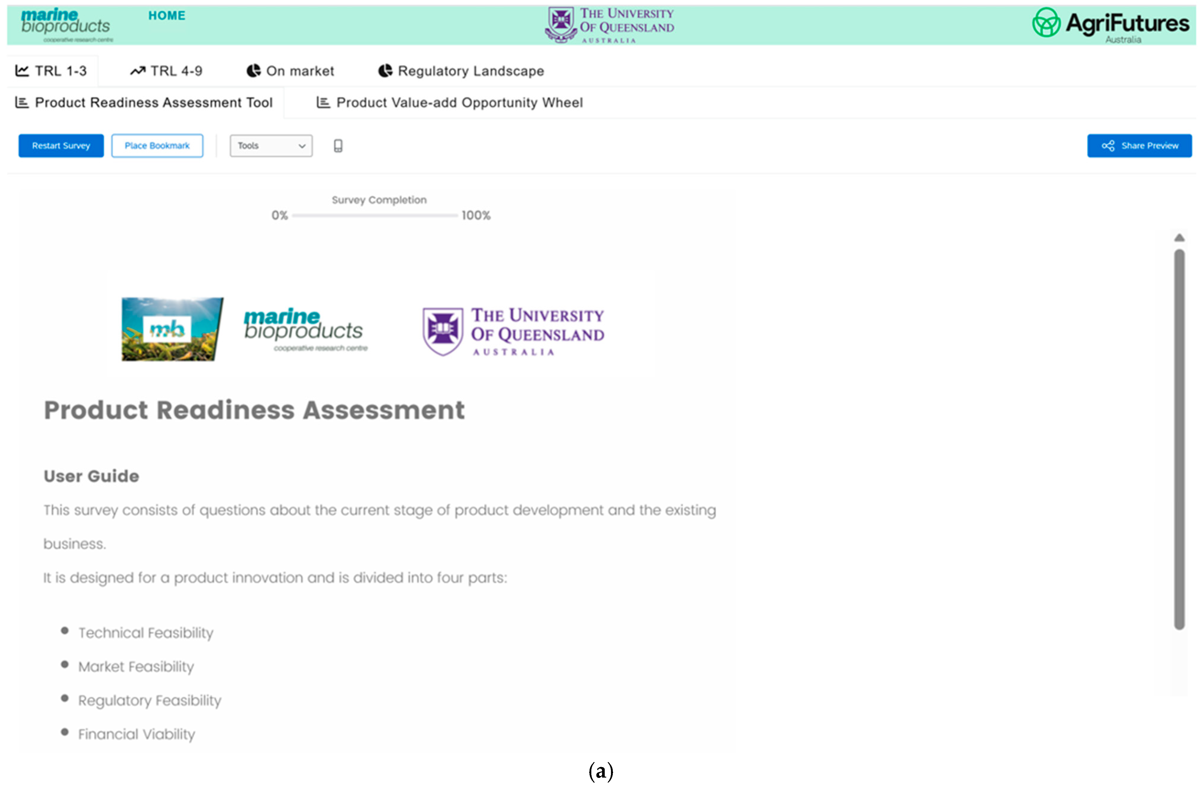 Figure 3. (a): Product Readiness Assessment Tool-Landing Page and User Guide (b) Product readiness assessment—an exemplar result of the questionnaire showing a start-up scenario, with advanced technical and financial readiness, and gaps in market and regulatory readiness.
