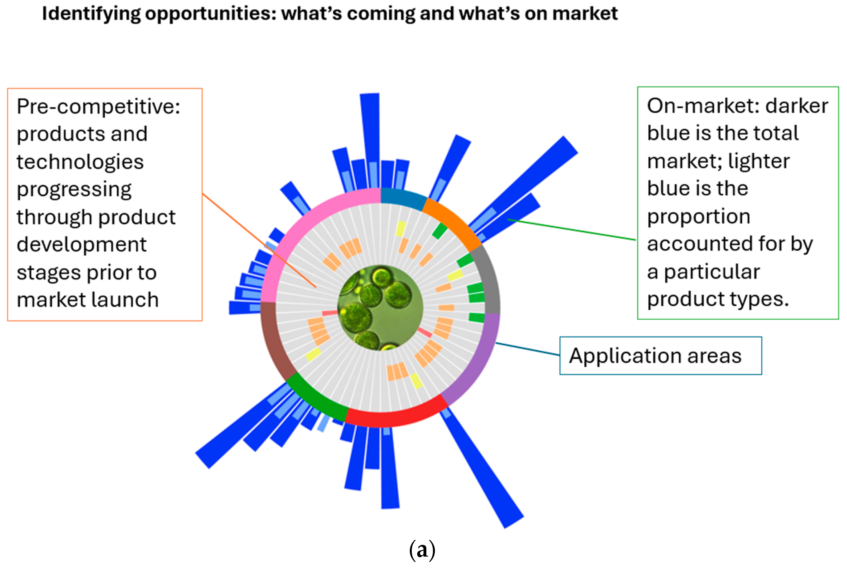 Based on the data sourced, a visual overview was developed: The Product Value-Add Opportunity Wheel, representing possible product development opportunities. It maps the product development stage by aligning the development level of products with their market size and growth for overall and microalgae-specific product markets. Figure 4a illustrates the overall product development landscape, while Figure 4b–e present examples across application categories. The inner-most ring represents the TRLs for each product, progressing from Fundamental Research, Applied Research, Pilot Stage, Pre-competitive, and Commercial stages. The outer bars indicate market size, with bar length corresponding to market value and the inner bar (light blue) showing the proportion attributable algal share of the market for the respective product.
