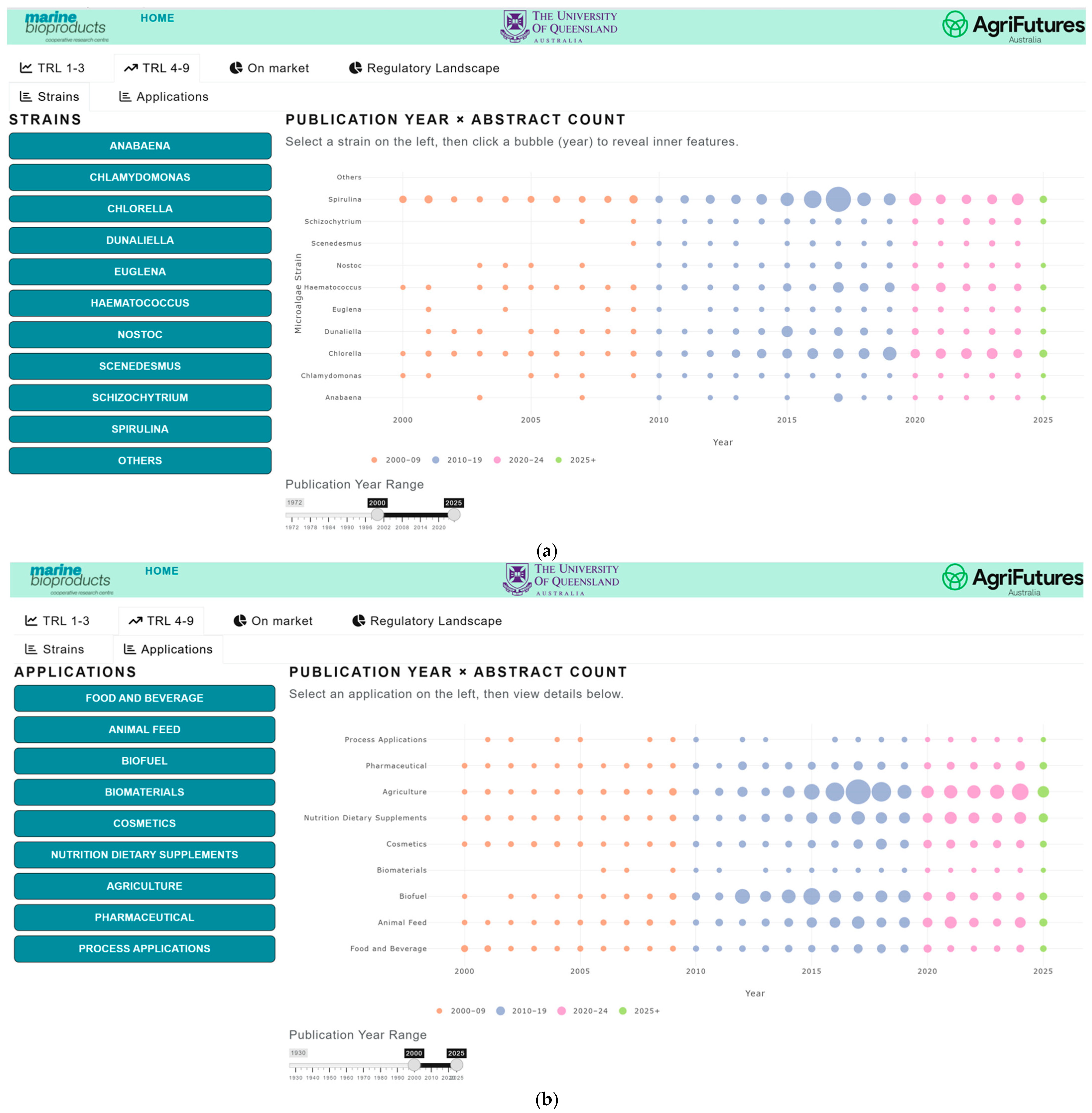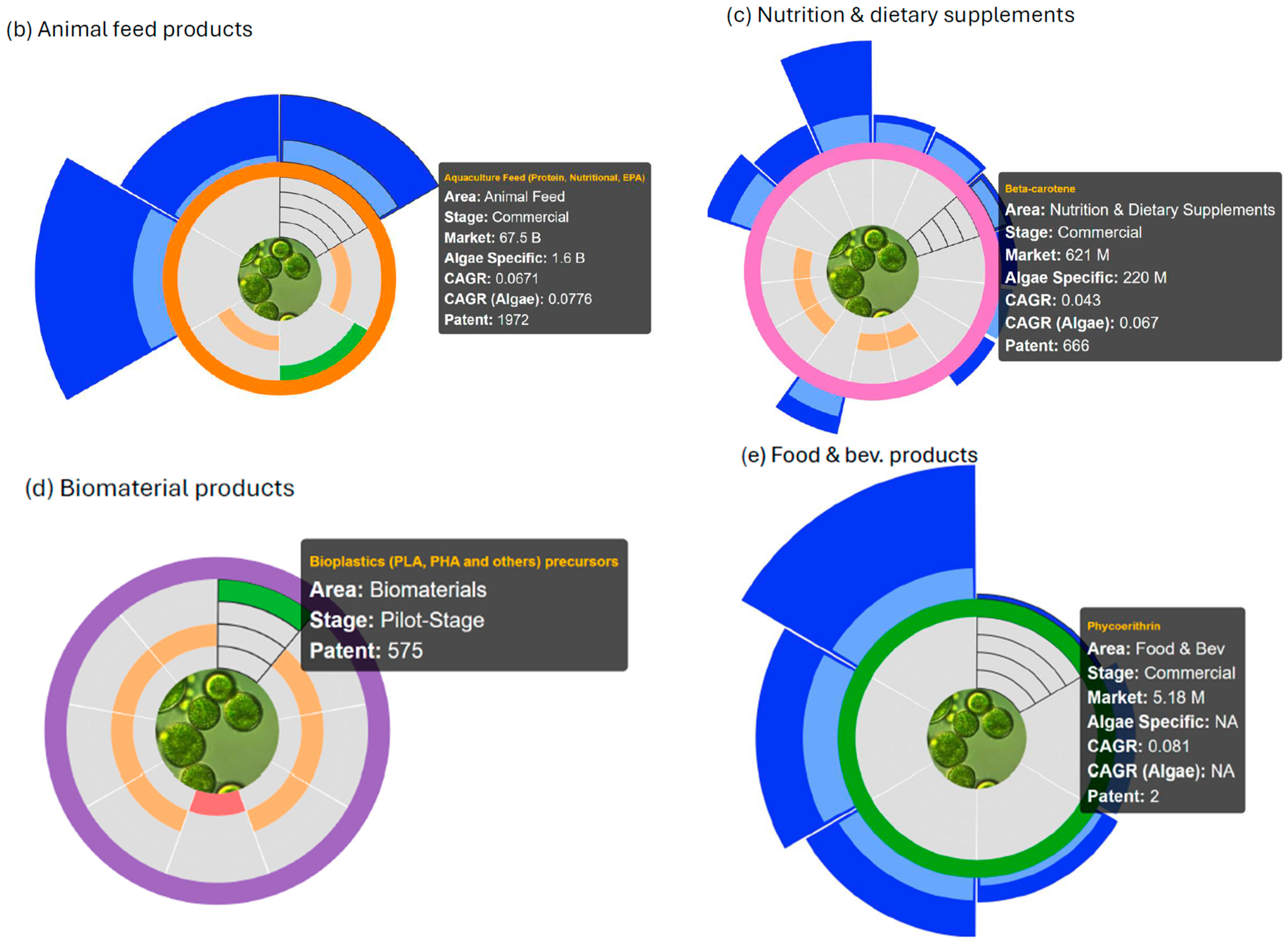 Figure 2 illustrates the dashboard’s architecture, structured around two main interconnected domains: pre-competitive and competitive. The pre-competitive domain focusses on early-stage R&D (ideation, TRL 1–3) by visualizing potential microalgae-based (co-products through the Product Value-Add Opportunity Wheel, monitoring patent trends across species and application areas (TRL 4–6), and providing tools to assess product readiness and regulatory compliance (TRL 7–9).