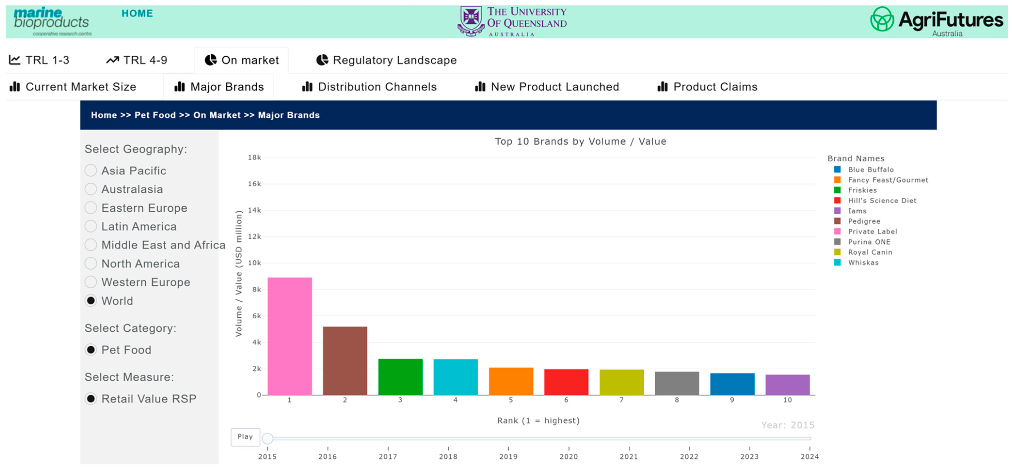 The market and competitive landscape are presented through historical data and trends in market size, major companies and brands, distribution channels, product launches, and major claims. Figure 7 shows a case example of the trend in markets and its growth for pet food. The market landscape also shows major brands (Figure 8) and distribution channels (Figure 9), as well as product launches in food, beverage and healthcare (Figure 10) and its sub-categories (Figure 11) and claims (Figure 12) for products with microalgae as one of their ingredients. Capturing and analyzing the demand/market pull dynamics facing a new product, technology or service as it progresses through its development cycle is essential for finding a realistic market niche that will support market entry and penetration.