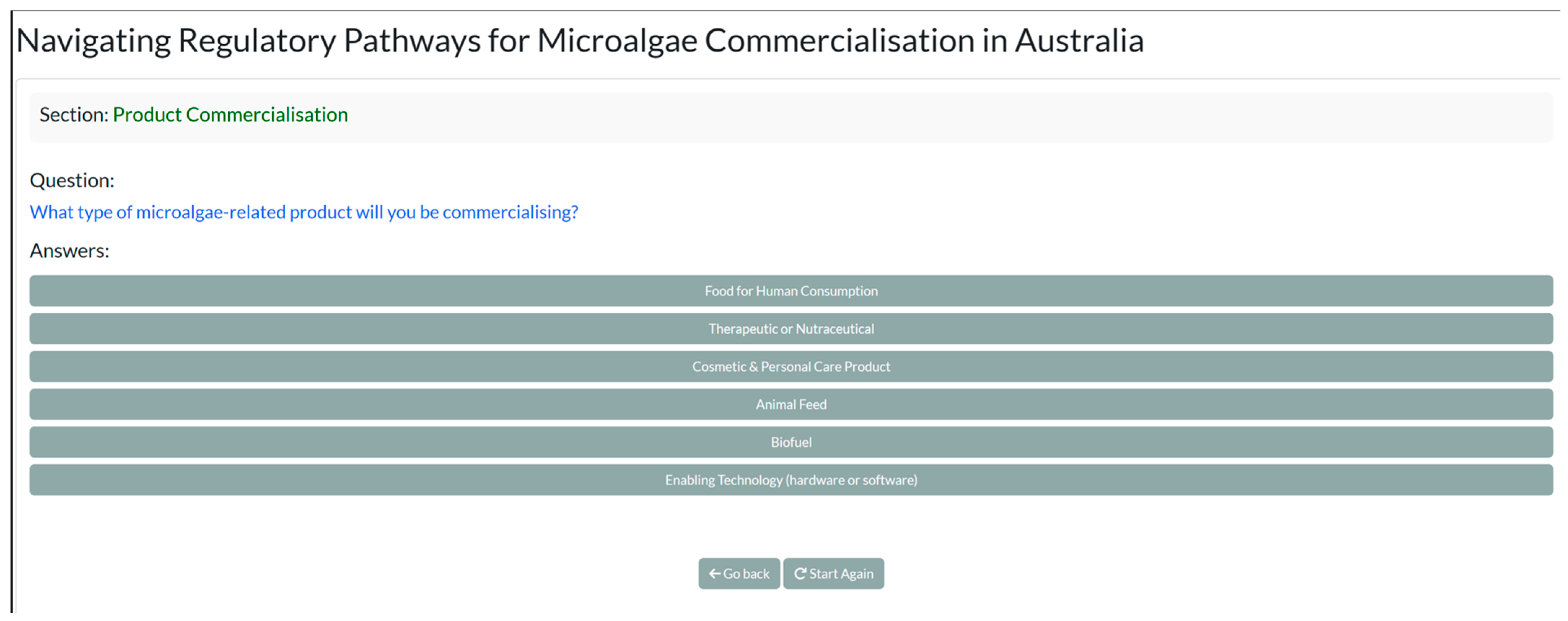 Figure 13. Tool for navigating the regulatory pathways for microalgae commercialization.