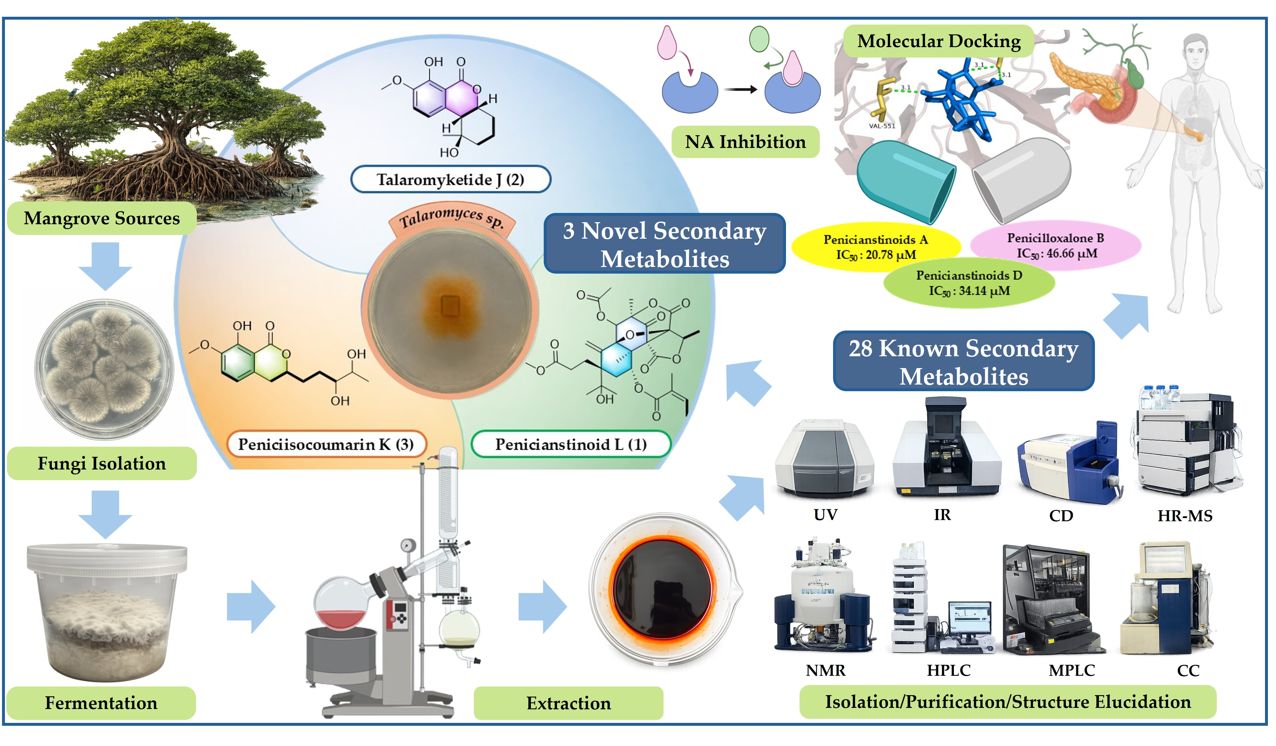 - Mei, R.Q.; Wang, B.; Zeng, W.N.; Huang, G.L.; Chen, G.Y.; Zheng, C.J. Bioactive isocoumarins isolated from a mangrove-derived fungus Penicillium sp. MGP11. Nat. Prod. Res. 2022, 36, 1260–1265. [Google Scholar] [CrossRef]