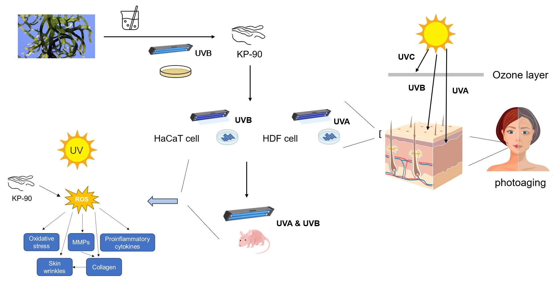 Therefore, in this study, we applied UV/H2O2 technology to prepare a low-molecular-weight polysaccharide from Kappaphycus alvarezii and investigated its anti-photoaging effects through in vitro models using epidermal and dermal cells, as well as an in vivo mice model. We systematically elucidated its mechanism of action via regulation of ECM metabolism. This work represents the first application of UV/H2O2 technology in the preparation of KP polysaccharides, offering a green, efficient, and sustainable approach to enhance the utilization of algal biomass. Furthermore, it is the first study to explore the anti-photoaging activity of KP extracts, aiming to unlock its potential in skincare and promote the comprehensive development and utilization of marine bio-resources, thereby contributing to the growth of the blue bioeconomy.