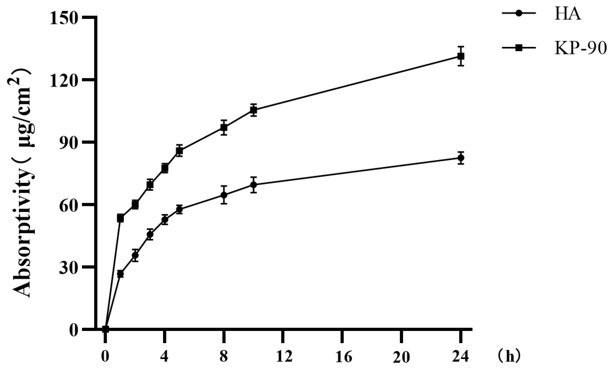 Figure 1, KP-90 exhibited superior skin permeation compared to hyaluronic acid, a phenomenon that may involve passive diffusion transport [
