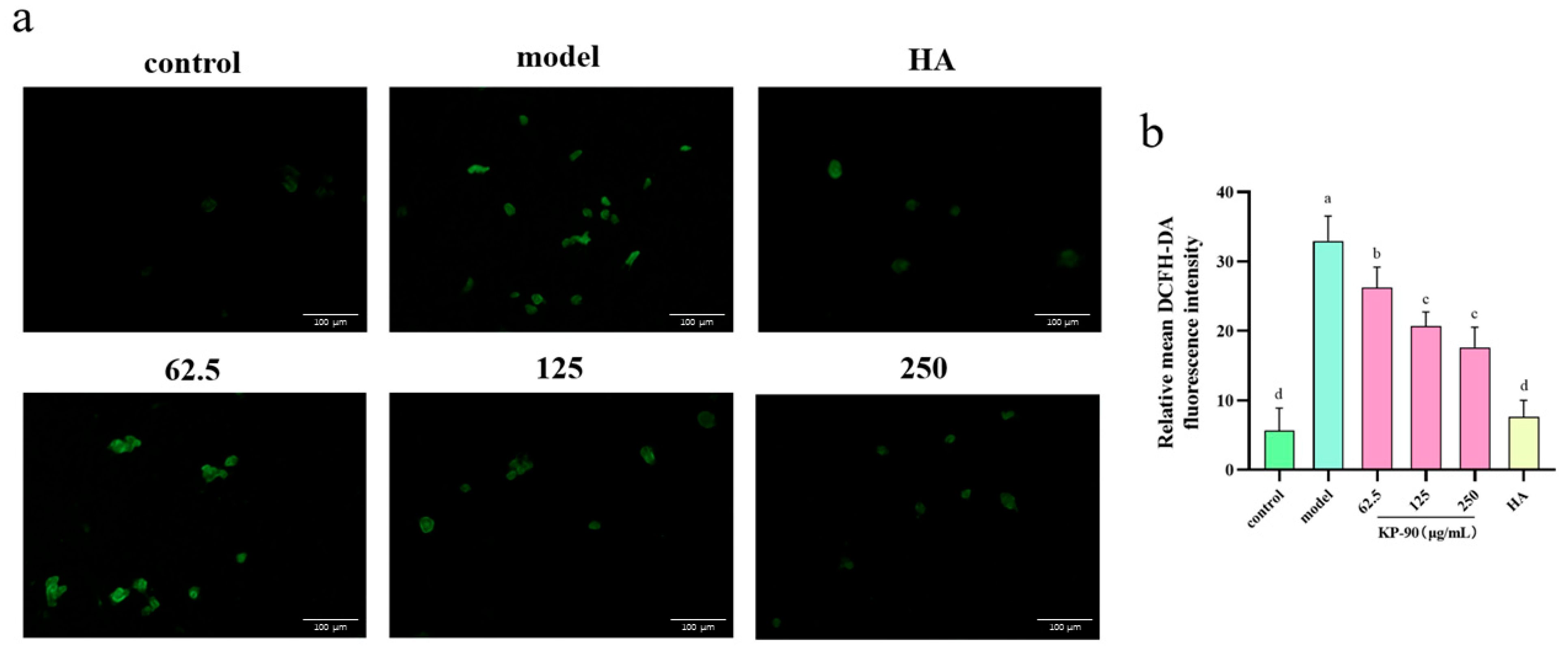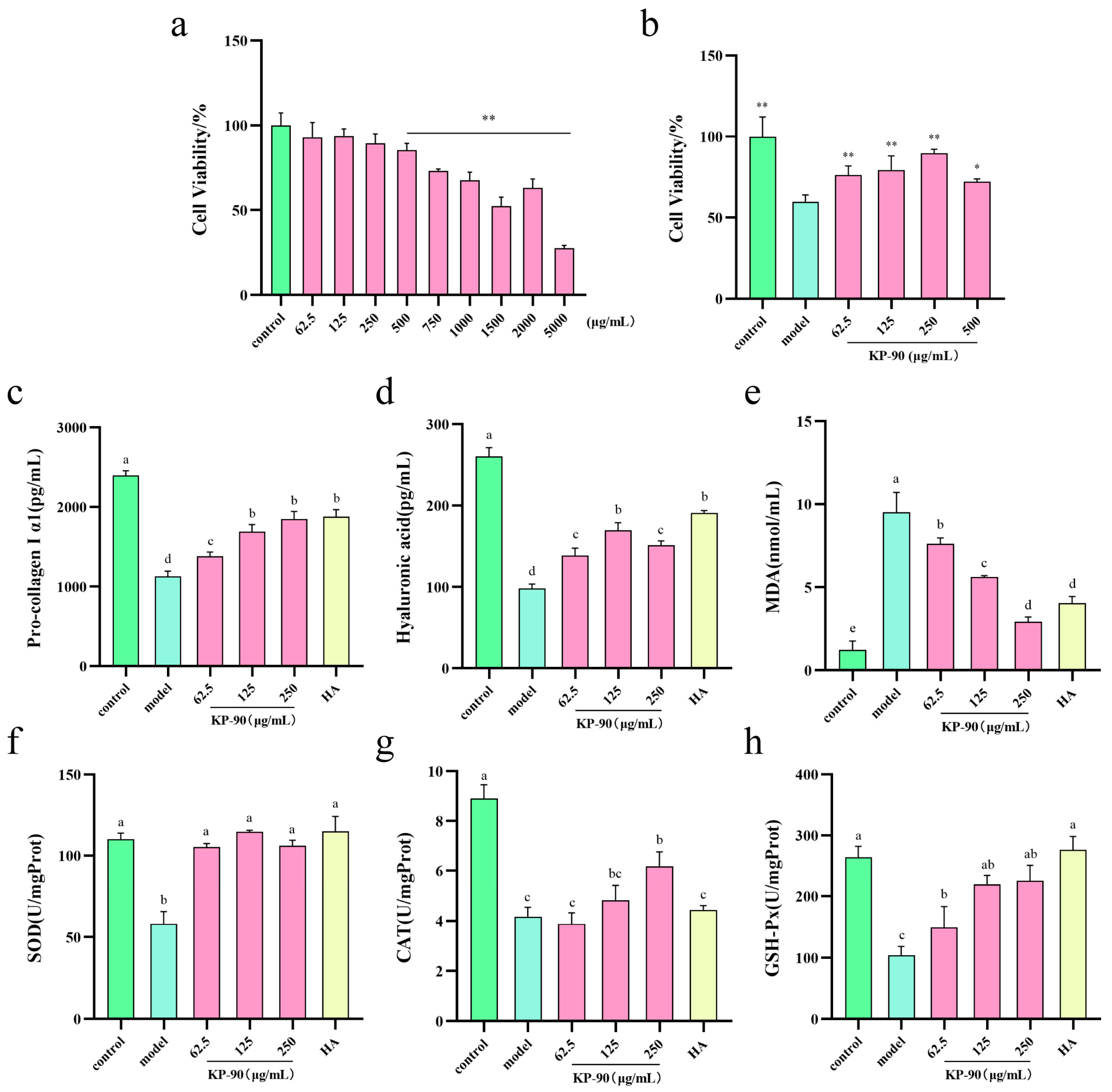 5 cells per well. Experimental groups were treated with KP-90 at concentrations of 125, 250, and 500 μg/mL, while 500 μg/mL hyaluronic acid was used as a positive control. After 24 h of treatment, the culture supernatant was collected. Cells were then lysed by adding a quantified amount of lysis buffer and incubating on ice for 20 min. Residual cells were scraped off using a cell scraper, transferred to EP tubes, and further lysed on ice for another 20 min. After centrifugation, the supernatant was collected as the cell lysate. Protein concentration in the lysate was determined using a BCA protein assay kit which was purchased from Nanjing Jiancheng Bio-Technology Co., Ltd. (Nanjing, China).