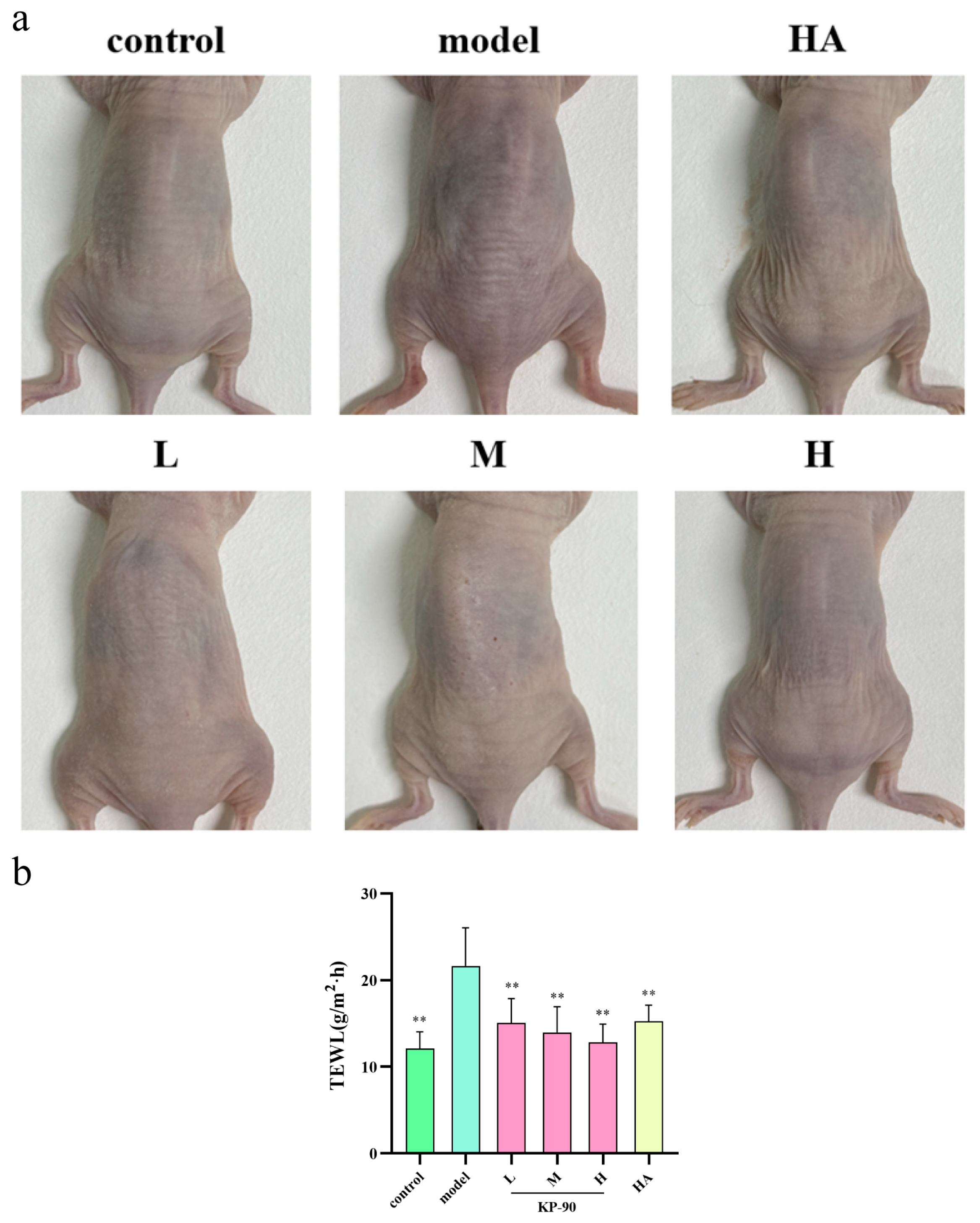 35]. The significant reduction in TEWL observed in the KP-90 groups compared to the model group suggests that topical application of KP-90 helps alleviate photoaging damage and maintains skin barrier integrity. In a related study, Kage et al. applied hyaluronic acid tetrasaccharide to hairless mice and found that it effectively promoted the recovery of skin function after UVA exposure, notably reducing the increased TEWL and attenuating epidermal hyperplasia [