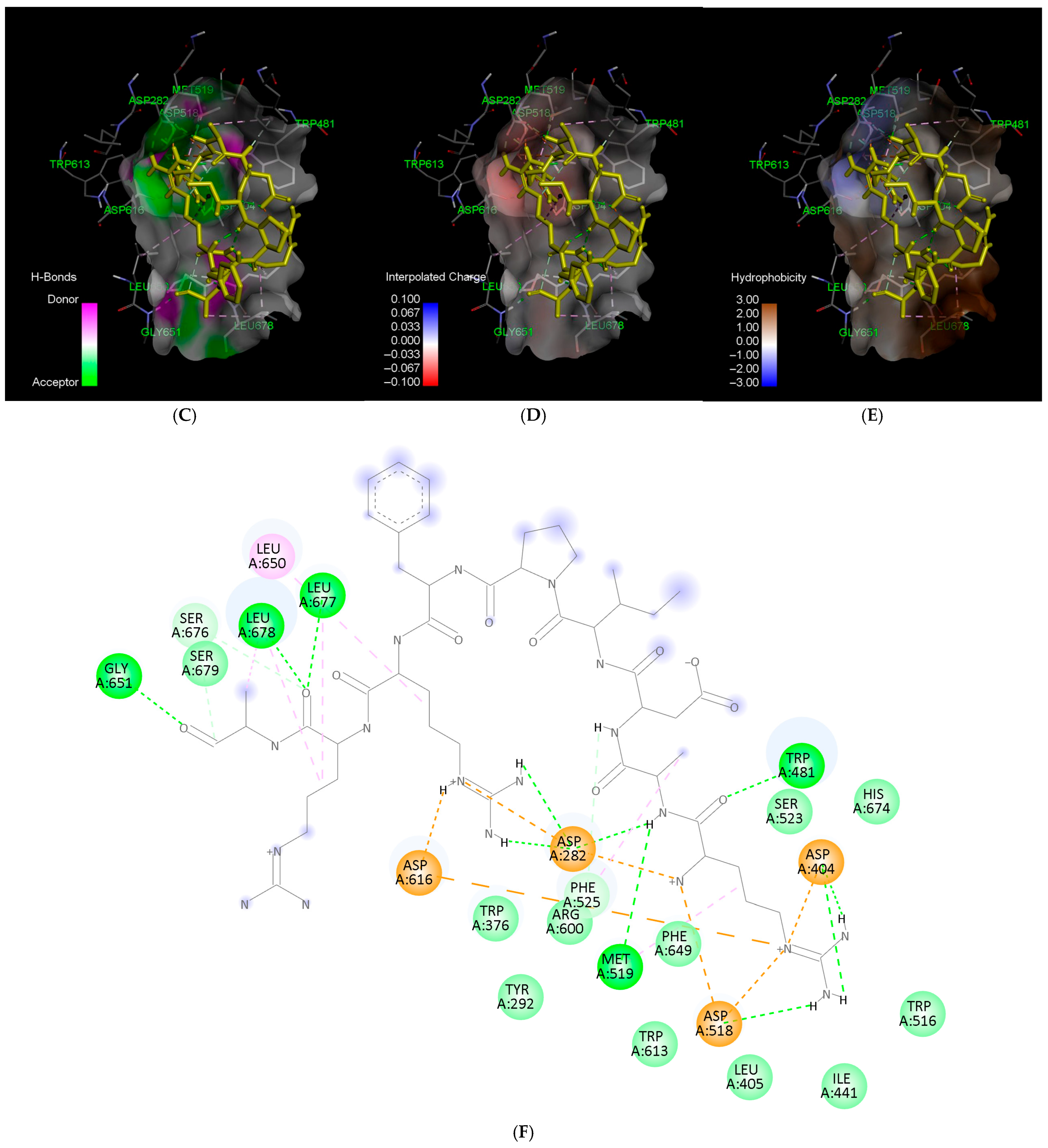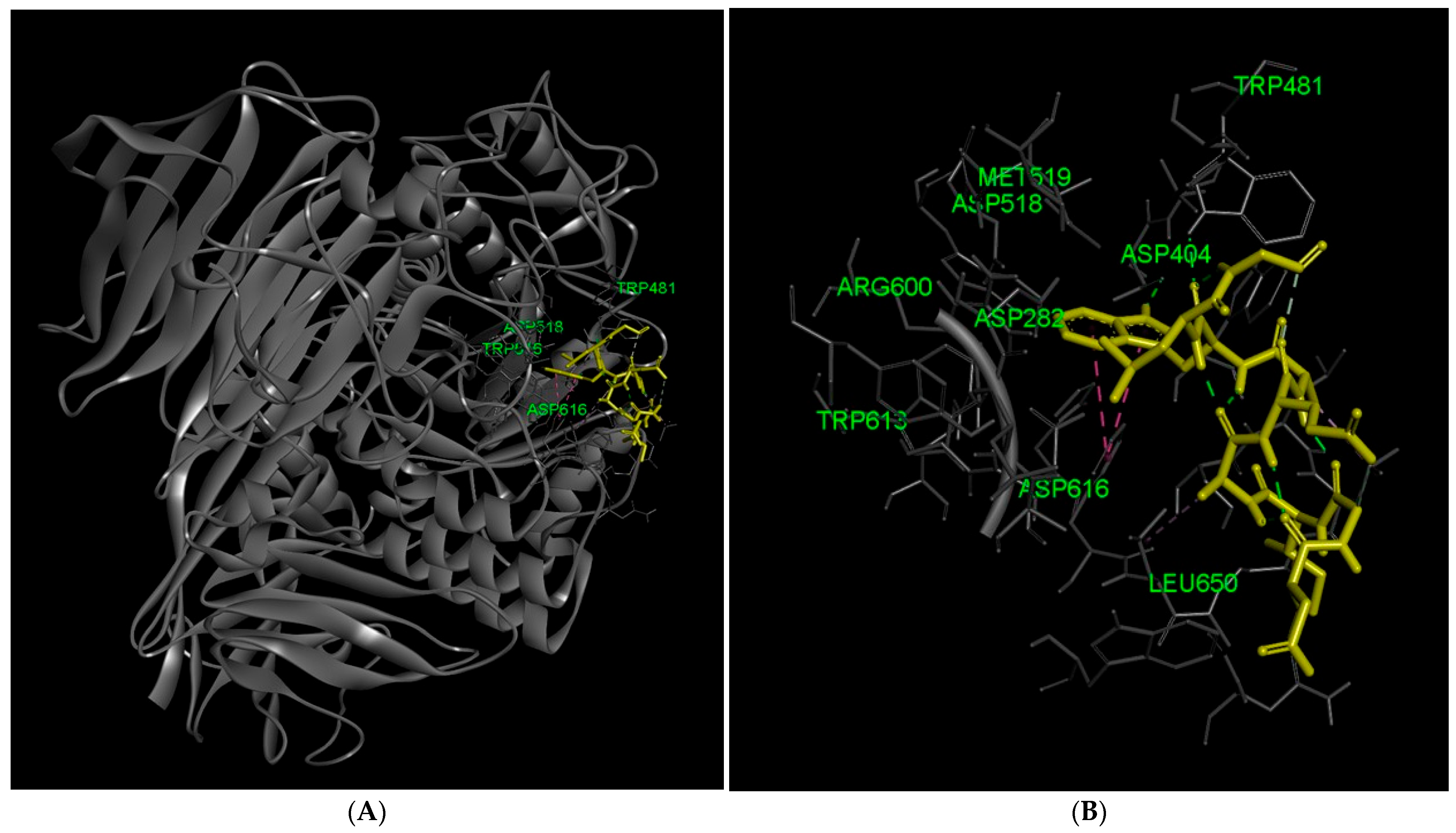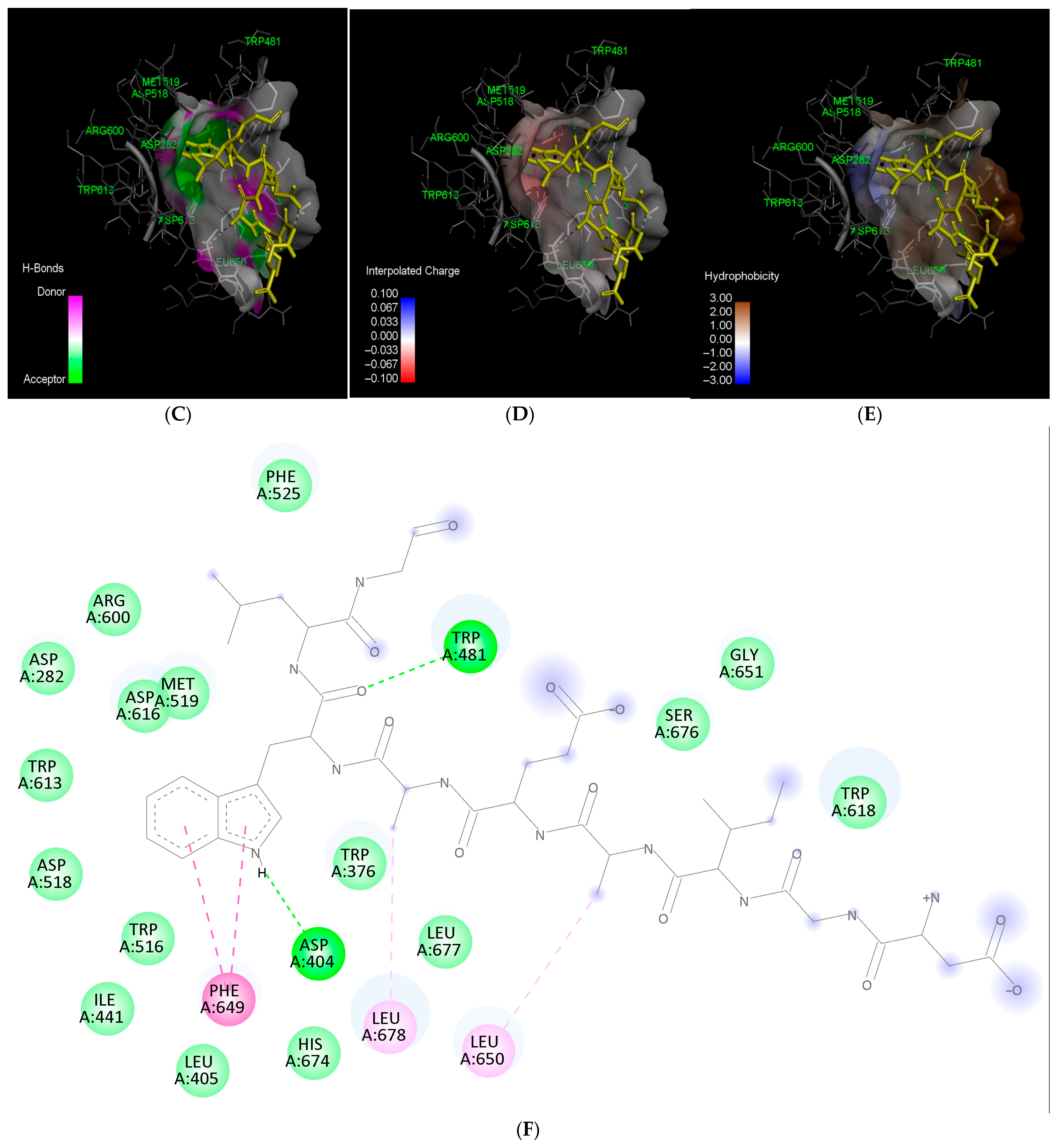 2.4. Molecular Docking of Selected α-Glucosidase-Inhibiting Peptides