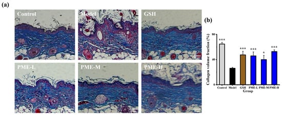 Effects of PME on collagen fibers of photoaged nude mice skin. Masson staining for epidermis and dermis in mice dorsal skin (a), collagen volume fraction (b). Scale bar = 50 μm. * p < 0.05 or *** p < 0.001 vs. Model group. Data are presented as the mean ± SD (n = 6).