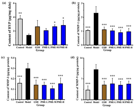 Effects of PME on contents of HYP (a), MMP-1 (b), MMP-3 (c), and MMP-9 (d) in photoaged nude mice skin. * p < 0.05, ** p < 0.01 or *** p < 0.001 vs. Model group. Data are presented as the mean ± SD (n = 6).