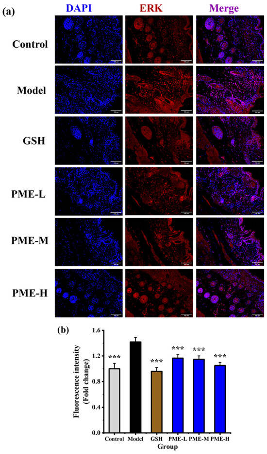 Extracellular signal-regulated kinase (ERK), a key member of the MAPK family, has been identified as an important target for the chemoprevention of skin diseases [51]. UVB irradiation has been shown to activate ERK [52], and ERK expression is widely used as an indicator of photoaging. In this study, ERK expression in UVB-irradiated nude mouse skin was assessed by immunofluorescence staining to evaluate the in vivo anti-photoaging effect of PME. As shown in Figure 8a,b, ERK expression was significantly increased in the Model group compared with the Control group (p < 0.05), reaching 1.41-fold of the Control. PME treatment reduced ERK expression in a concentration-dependent manner, with values of 1.16-, 1.14- and 1.05-fold of the Control under PME-L, PME-M and PME-H, respectively. The ERK level in the PME-H group did not differ significantly from those in the GSH and Control groups (p > 0.05), indicating that PME-H inhibited ERK expression to an extent comparable with GSH and effectively restored ERK to control levels. However, ERK pathway activity is most reliably assessed by phosphorylated ERK (p-ERK), which reflects pathway activation. Measuring only total ERK by immunofluorescence cannot fully explain activation status or functional changes, and therefore the mechanistic conclusions regarding ERK should be interpreted with caution which is the limitation of the present study.