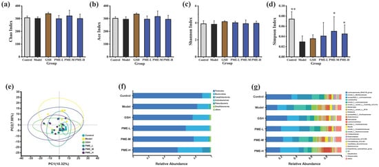 Effects of PME on Chao Index (a), Ace Index (b), Shannon Index (c), and Simpson Index (d); PCA analysis (e); PME modulates the relative abundance of gut microbiota on phylum level (f) and genus level (g). * p < 0.05, ** p < 0.01 vs. Model group. Data are presented as the mean ± SD (n = 6).