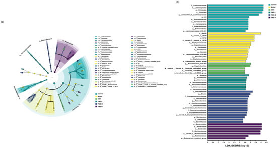 The species difference analysis after PME intervention. Cladogram of LEfSe analysis (a), distribution histogram (LDA > 3) (b).