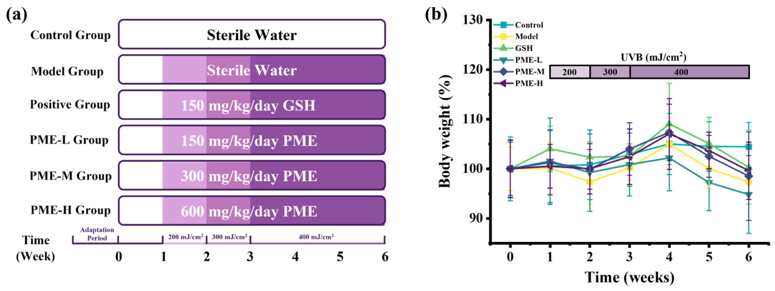 2.1. The Effects of PME on Body Weight in Photoaged Nude Mice