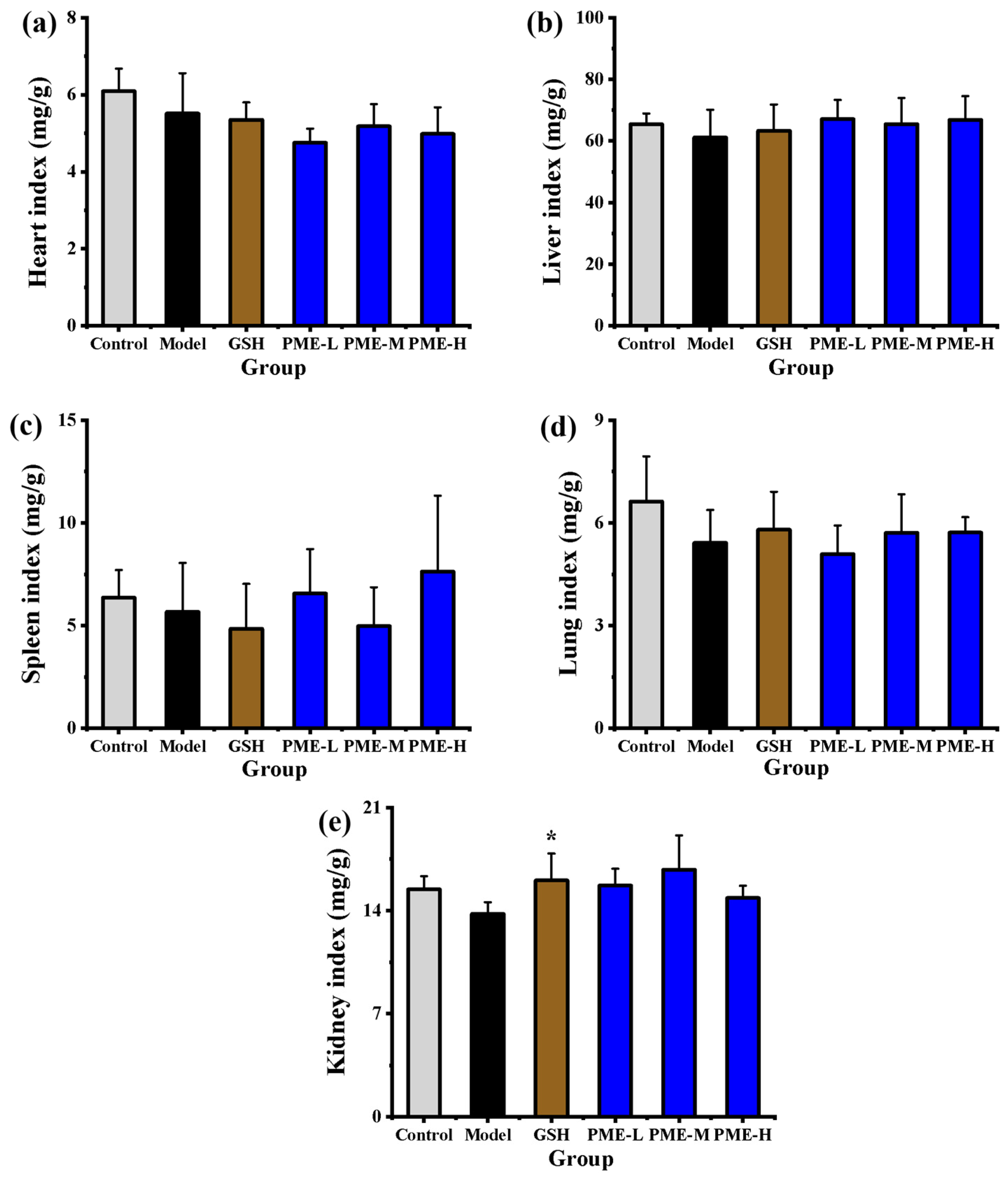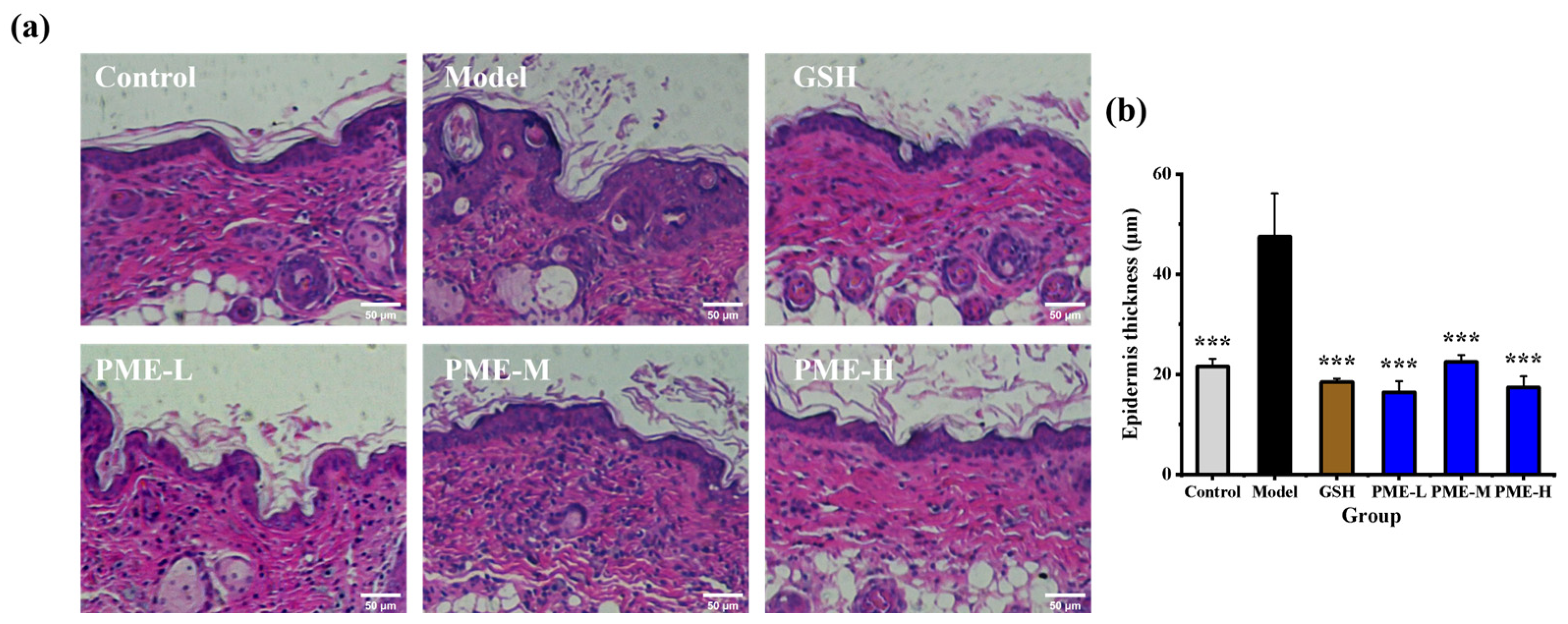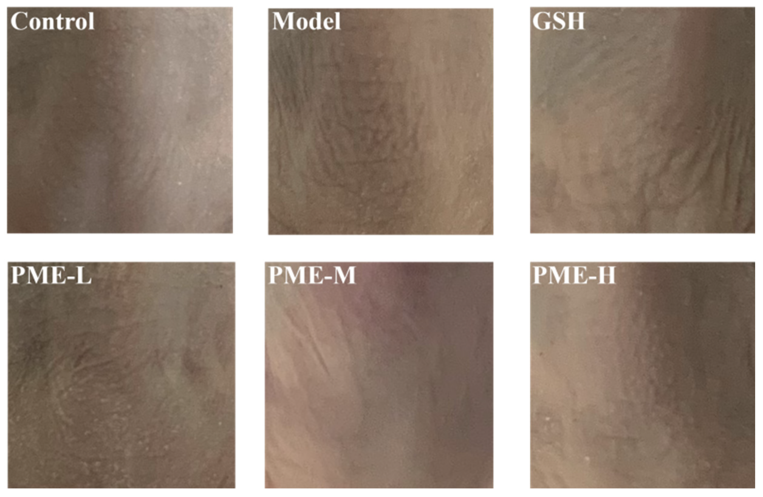 2.3. The Effects of PME on Organ Indexes in Photoaged Nude Mice