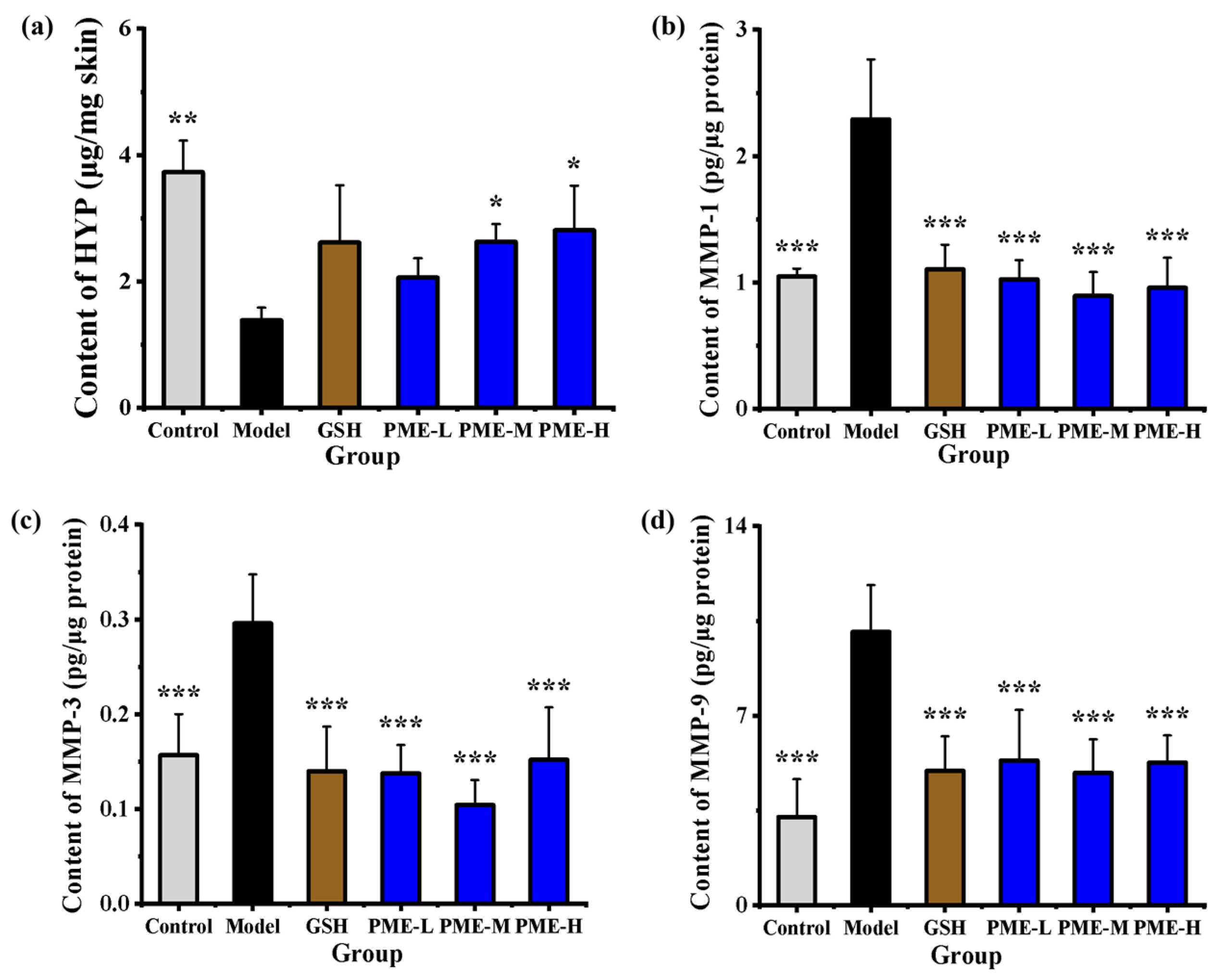 2.7. The Effects of PME on Levels of HYP, MMP-1, MMP-3 and MMP-9 in Photoaged Nude Mice