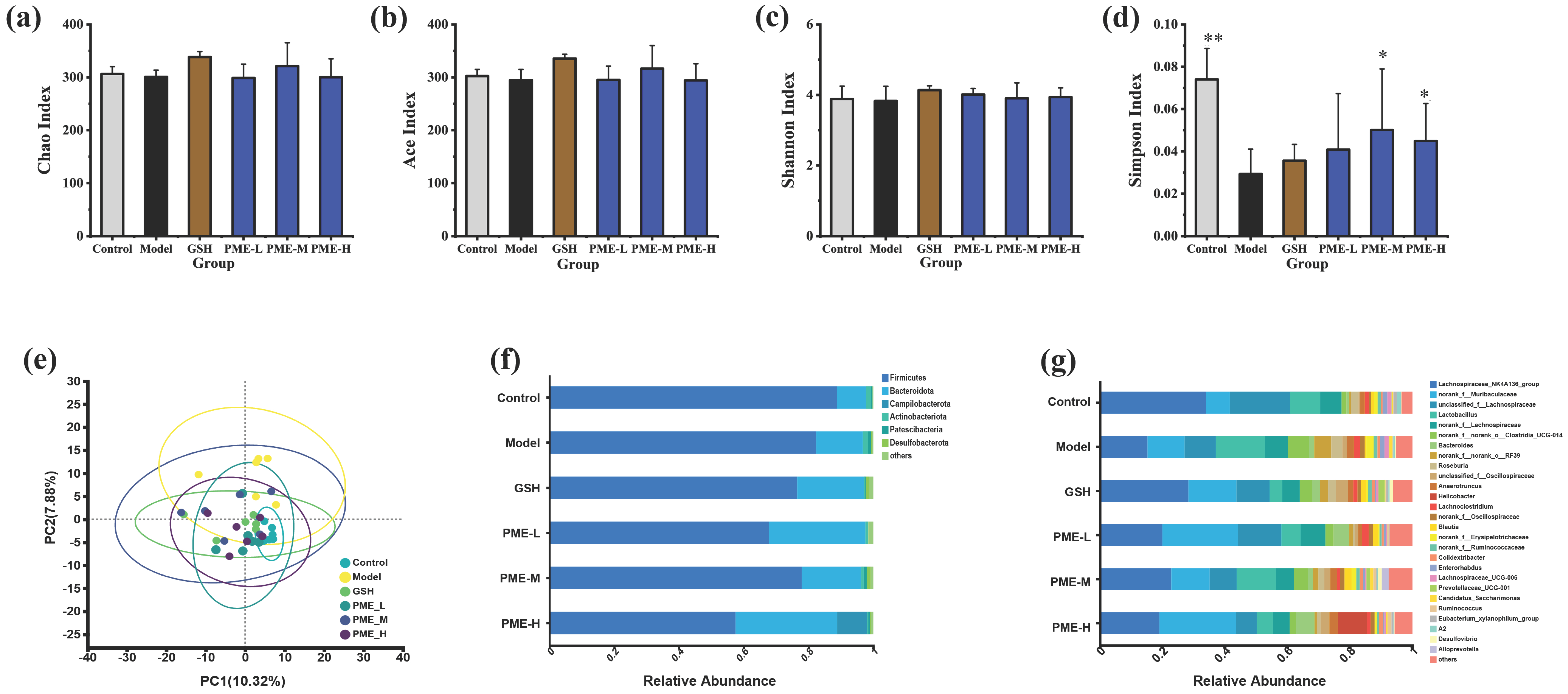 2.11. The Effects of PME on Diversity and Composition of Gut Microbiota in Photoaged Nude Mice
