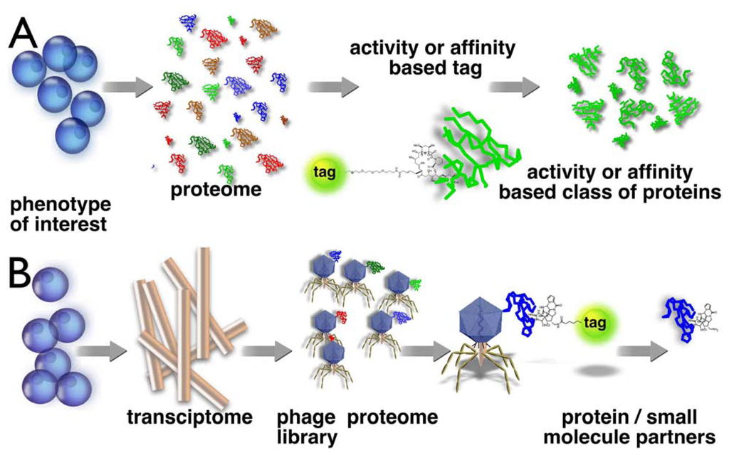 Schematic representation of chemical proteomics and reverse chemical proteomics. In chemical proteomics (A), one uses a small molecule (e.g. marine natural product) to construct an affinity or activity probe to isolate specific proteins or a family of proteins. In reverse chemical proteomics (B), we start with the transcriptome, which is cloned into an amplifiable vector (e.g. a virus) that expresses a single protein from the proteome on its surface. A tagged natural product can be used to probe the tagged proteome in an iterative manner.