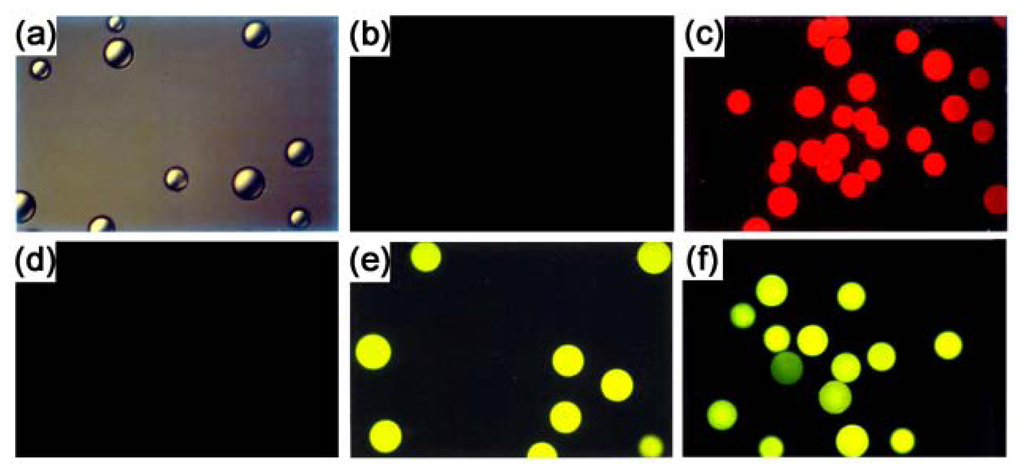 Epifluorescence micrographs of PS resins (100× magnification, 450–490 nm bandpass excitation filter, 520 nm low pass emission filter). (a) Underivatised PS resin as viewed under phase contrast illumination. (b) Underivatised PS resin treated with congo red (control). (c) Bromomethylated PS resin treated with congo red (14). (d) Underivatised PS resin treated with fluorescein-NHS (control). (e) PS-NH2 resin treated with fluorescein-NHS (16). (f) PS-PEG-NH2 resin treated with fluorescein-NHS (20).