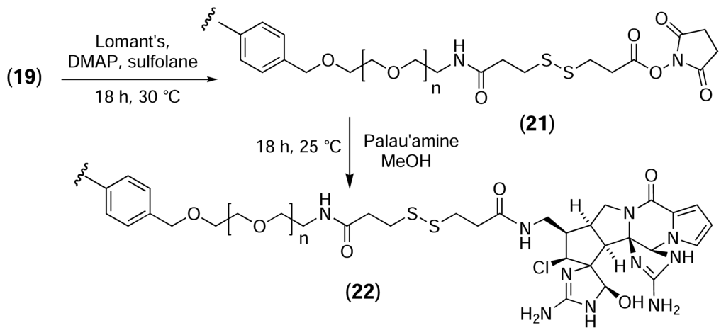Derivatisation of PS microtitre plates with palau’amine via a cleavable (disulfide-containing) PEG linker.
