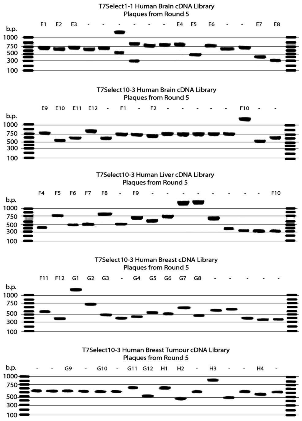 Agarose gel electrophoresis of PCR products obtained from various phage-displayed human cDNA libraries after five rounds of selection with palau’amine immobilised on a PS plate via a cleavable disulfide-containing linker. The DNA inserts were amplified using generic T7 primers.