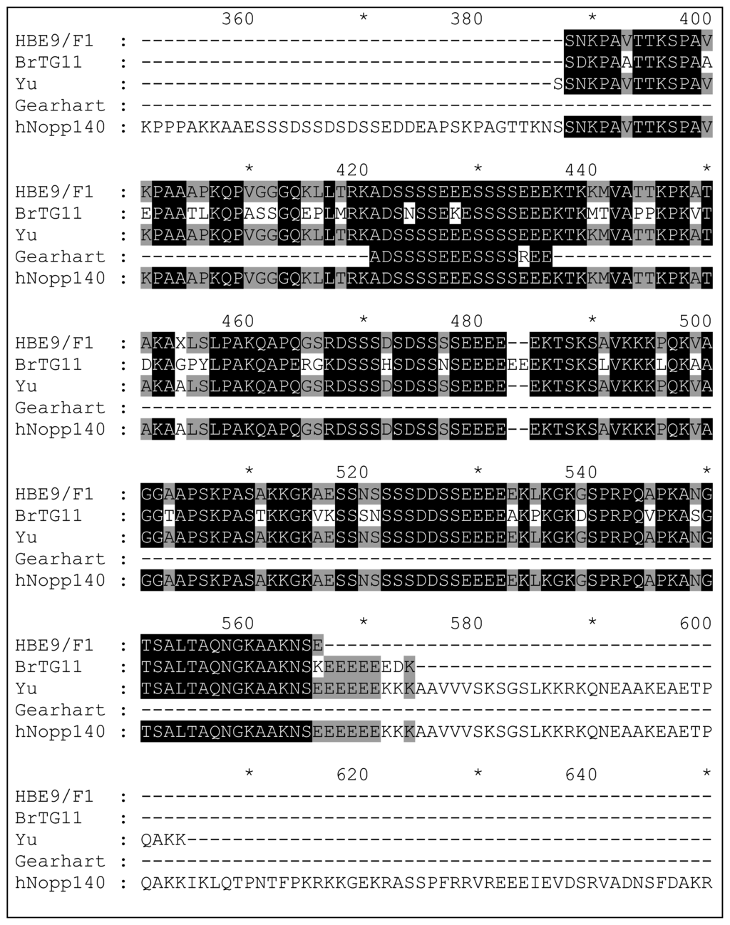 The DNA gels of the PCR products obtained from randomly selected plaques showed a range of different sized DNA inserts in all five libraries, indicating the selections had not reached a consensus after five rounds. Analysis of the DNA sequences obtained revealed the majority of clones contained DNA inserts that were either in backwards (25%), not in the correct reading frame (20%), not in the coding region of the encoded gene (10%) or expressed only short peptides (32%). However, two clones rescued from the T7Select10-3 human brain library (E9/F1) contained the C-terminal domain of nucleolar and coiled-body phosphoprotein 1 (hNopp140), and one clone rescued from the breast tumour library (G11) contained the C-terminal domain of the almost identical nucleolar phosphoprotein p130 (Fig. 14), both of which are involved in biogenesis of the nucleolus [].