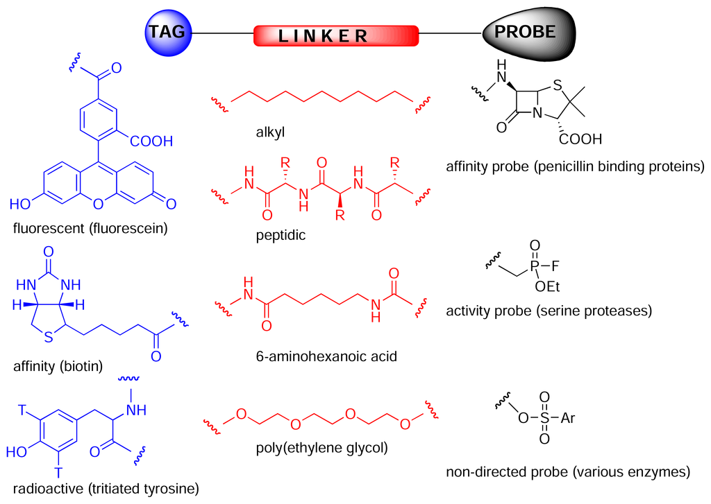 Chemical proteomics probes [] are composed of a tag (or anchor such as polystyrene), a linker (spacer) and probe or reactive group. The probe can be a drug, natural product, peptide, reactive group or anything and can react covalently or non-covalently with its biological receptor, which can have more or less specificity for the probe or react with a specific type of enzyme.