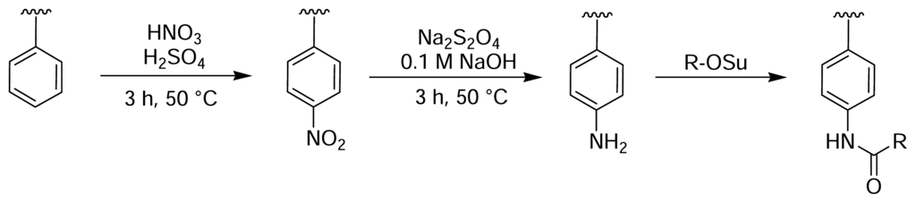 Nitration of PS microtitre plate wells with fuming nitric acid, followed by reduction with sodium dithionite, yields aromatic amine groups on the polymer surface [].