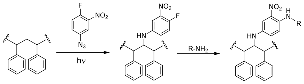 Nahar et al. used a photoactivated azide derivative to immobilise proteins [] and small molecules [] on the surface of PS microtitre plate wells. A methanolic solution of fluoronitroazidobenzene (FNAB) [] was allowed to evaporate in the wells of a PS microtitre plate. The plate was then exposed to UV light (365 nm), converting the azide into a highly reactive nitrene, which is capable of grafting to the PS backbone. The resulting fluoronitrobenzene adduct could then undergo nucleophilic aromatic substitution with an amine-containing molecule of choice (Fig. 6). Similarly, Ito and co-workers photografted an azide onto the surface of PS plates []. Initially, the plates were treated with 4-azidobenzoic acid in the presence of UV light, and the resulting benzoic acid adduct was converted to the NHS ester for subsequent coupling with insulin.