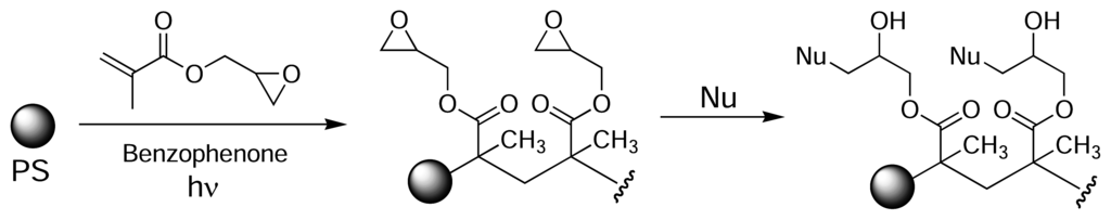 Photografting of glycidylmethacrylate onto PS microtitre plates using UV light in the presence of a benzophenone photoinitiator [].