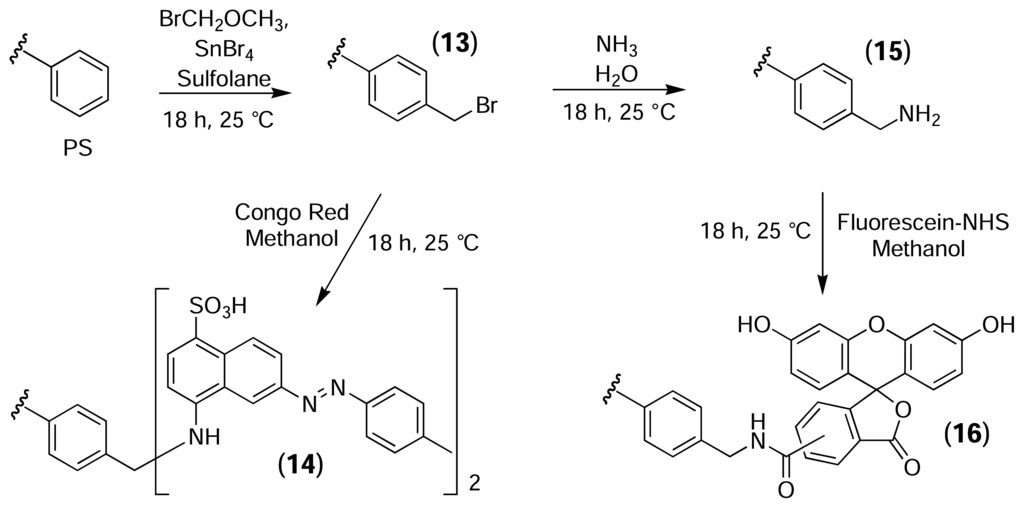 Cross-linked PS resin was used as a model system to evaluate the protocols described by Clark []. The high loading capacity of the resin (>1 mmol/g) allowed the use of fluorescent probes to follow the reactions visually (Fig. 8). Initially, PS resin was bromomethylated using the same conditions reported by Clark for PS microtitre plates. One portion of the activated resin (13) was treated with congo red (λem = 600 nm) to yield (14), while a second portion of activated resin was first converted to the aminomethylated derivative (15) and was then reacted with fluorescein-NHS (λem = 520 nm) to yield (16). Portions of the underivatised PS resin were also treated with the dyes as controls.