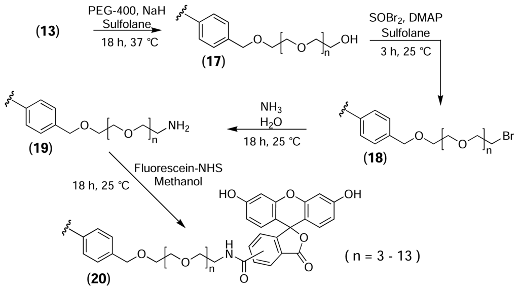 Derivatisation of bromomethylated PS with fluorescein via a non-cleavable PEG linker.