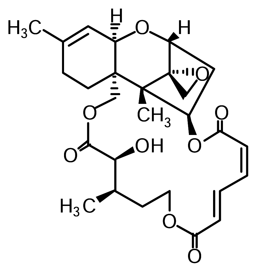 Namikoshi et al. isolated a new macrocyclic trichothecene, 12,13-deoxyrodidin E, and three known compounds (verrucarin A, verrucarin J, and roridin E) from a culture broth (No.42) of Myrothecium roridum (2002). The three known compounds showed strong cytotoxicity in human and murine leukemia cell lines (HL-60 and L1210, respectively), but 12,13-deoxyroridin E was about 8 fold less cytotoxic than roridin E, the epoxide variant.