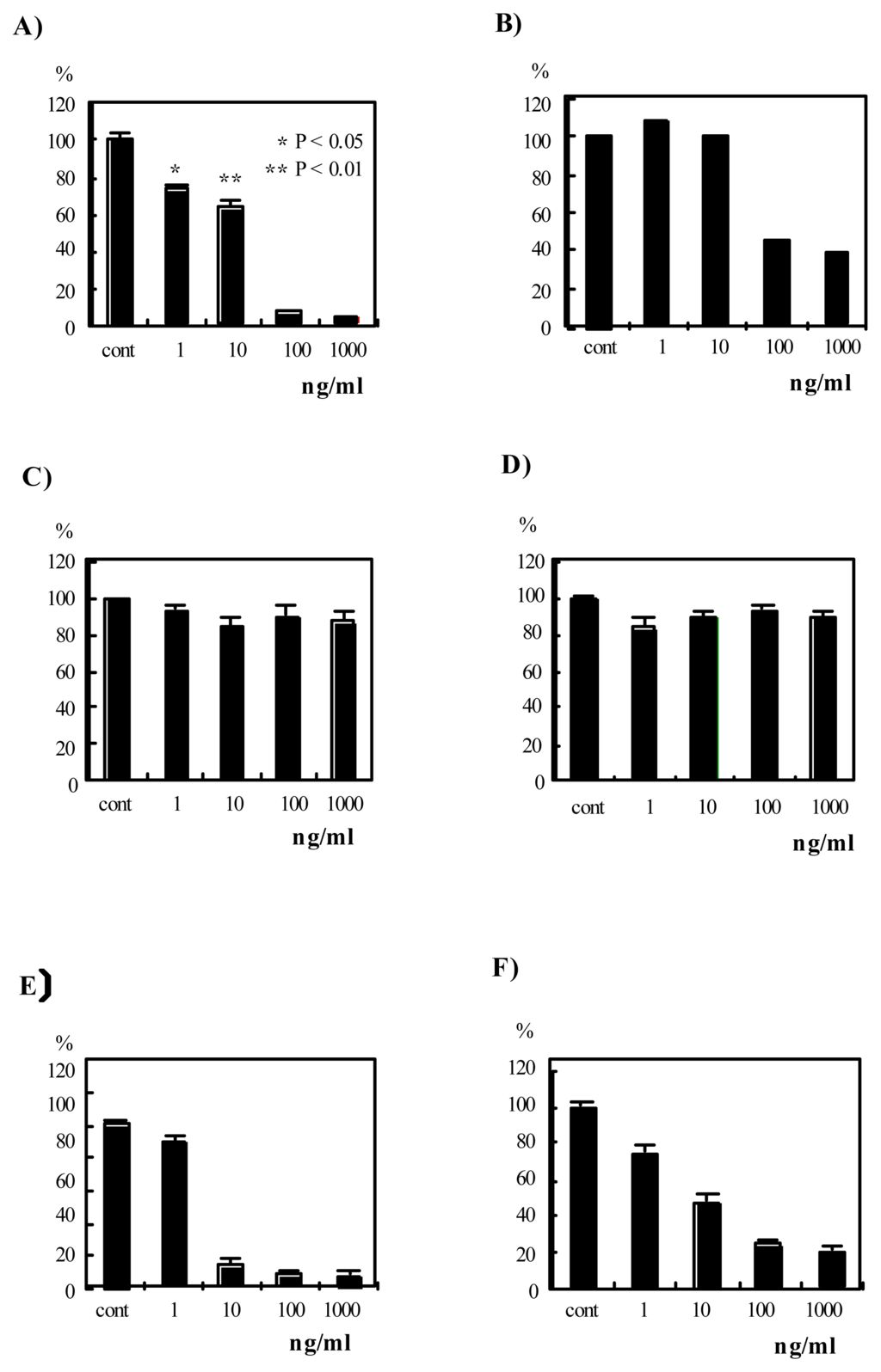 Therefore, the effects of verrucarin A, verrucarin J and roridin E on IL-8 production by PMA-stimulated HL-60 cells were examined, and the results are shown in Figure 2A, C and E. Verrucarin A and roridin E inhibited IL-8 production by PMA-stimulated HL-60 cells, but the inhibition by roridin E and verrucarin A (0.1 and 1 μg/ml) correlated with cell proliferation in the MTT assay. Therefore, it is estimated that the inhibition by roridin E and verrucarin A (0.1 and 1 μg/ml) is due to their cytotoxicity. On the other hand, verrucarin A (1 and 10 ng/ml) did not affect cell proliferation. Therefore, verrucarin A was of interest.