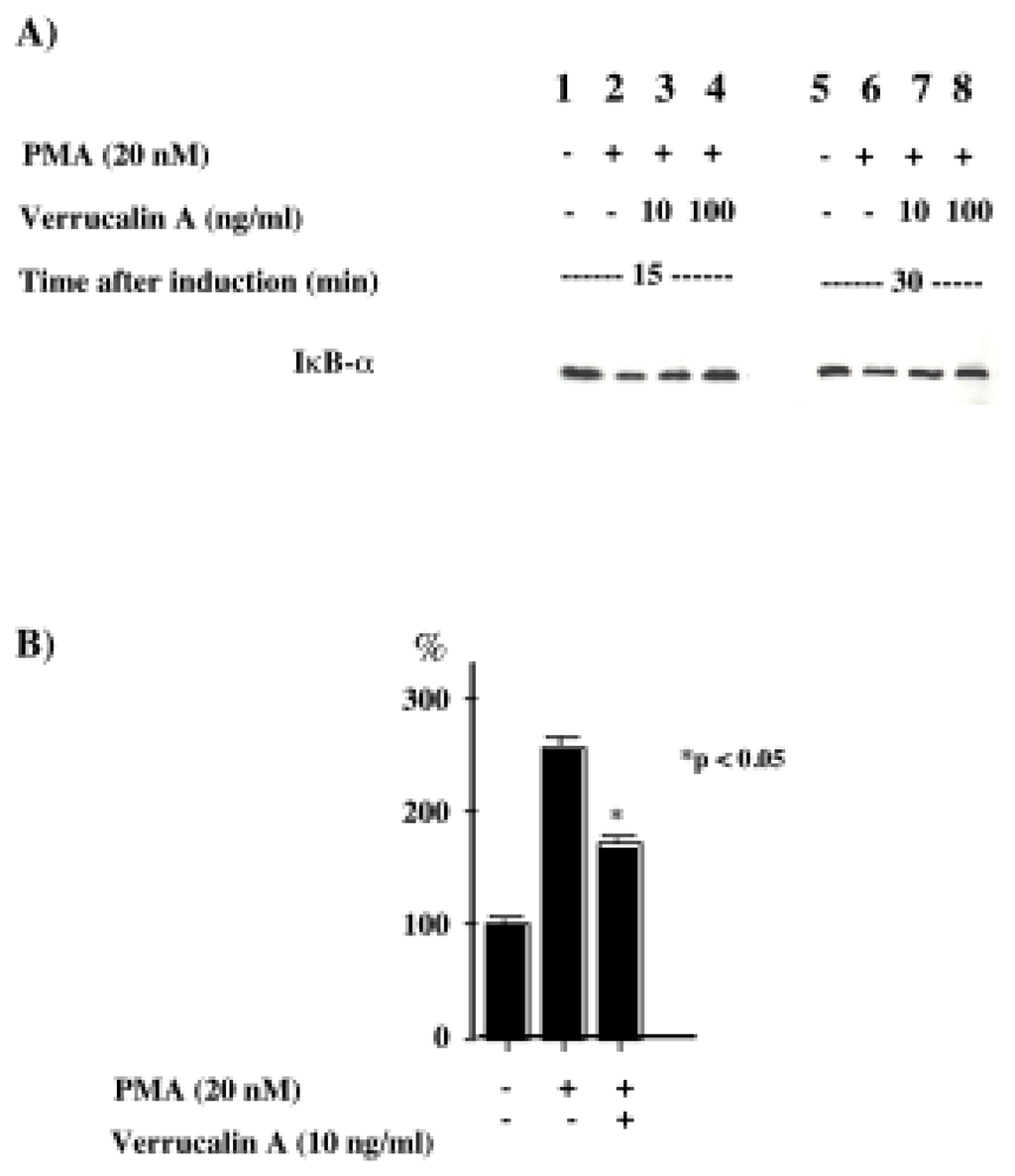 Effect of verrucarin A on the activation of NF-κB in PMA-stimulated HL-60 cells. A) Western blot analysis with polyclonal antiserum to IκB-α. Total protein extracted from the control (1 and 5) and PMA-stimulated HL-60 cells, with or without 15 or 30 min incubation with verrucarin A (2–4 and 6–8), was electrophoresed on 10% SDS-PAGE gels and examined by western blotting using polyclonal antiserum. B) Effect of verrucarin A on the transcriptional activation of the NF-κB binding region in PMA-stimulated HL-60 cells. HL-60 cells (2.5 x 107) were transfected with the reporter plasmid including the NF-κB binding region and treated with PMA (20 nM) and verrucarin A. The luciferase activities were determined as described in Materials and Methods. The activity of the cells treated with PMA (20 nM) was set at 100%. Each value is the average of the results from three independent experiments.