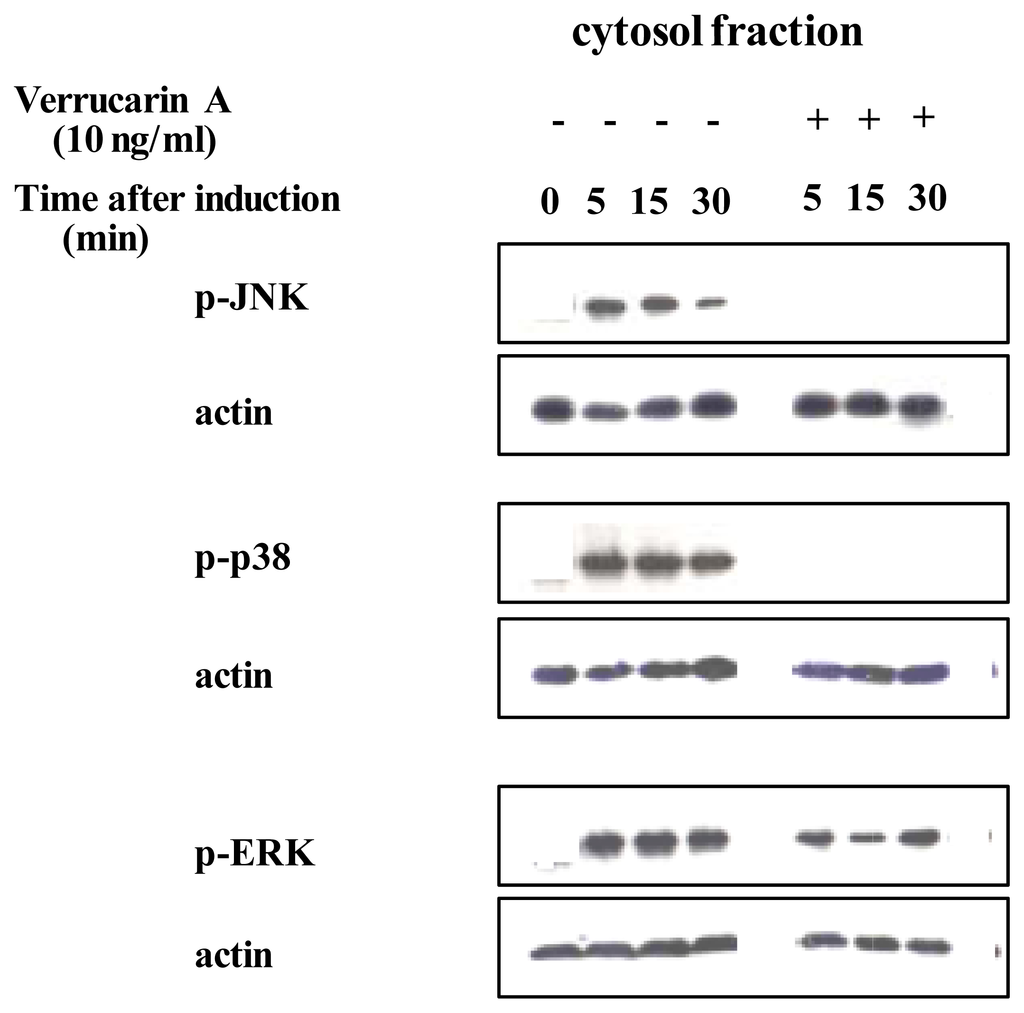 Effect of verrucarin A on the activation of the MAP kinase in PMA-stimulated HL-60 cells as determined by western blotting using phosphorylated anti-p38, -JNK and -ERK antibodies.